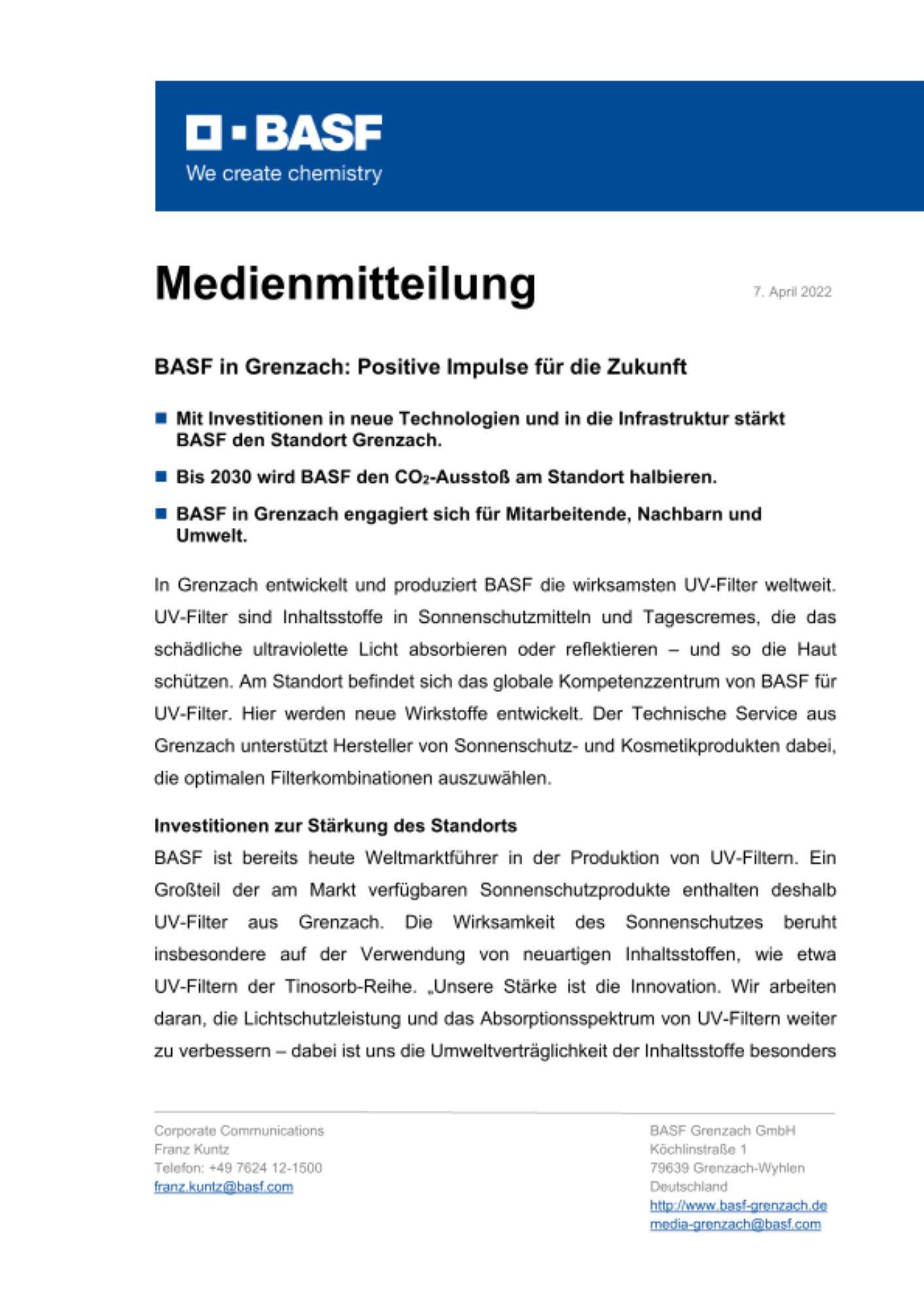An ihrem Standort in Grenzach entwickelt und produziert die BASF Inhaltsstoffe für die Kosmetik- und Körperpflegeindustrie. Hier befindet sich das globale BASF-Kompetenzzentrum für die Entwicklung und Produktion von innovativen UV-Filtern für Sonnenschutzprodukte und Kosmetika. Daneben betreibt die BASF am Standort die globale Entwicklung und den Technischen Service für antimikrobielle Wirkstoffe. Am BASF-Standort Grenzach sind rund 200 Mitarbeitende beschäftigt. Weitere Informationen zur BASF Grenzach GmbH unter www.basf-grenzach.de.