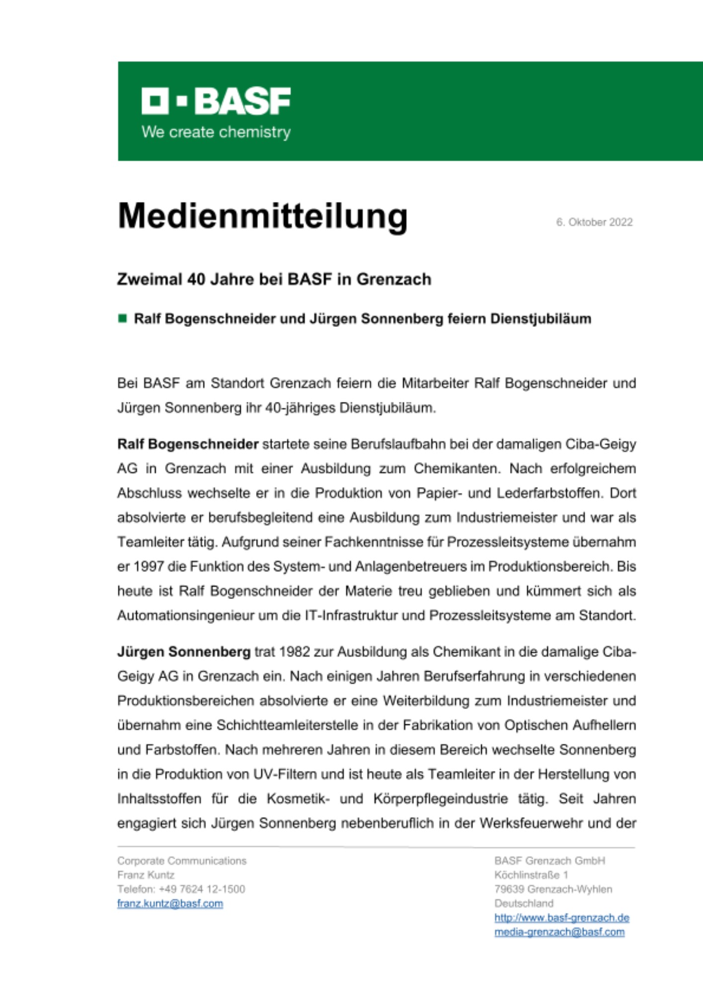 Bei BASF am Standort Grenzach feiern die Mitarbeiter Ralf Bogenschneider und Jürgen Sonnenberg ihr 40-jähriges Dienstjubiläum.