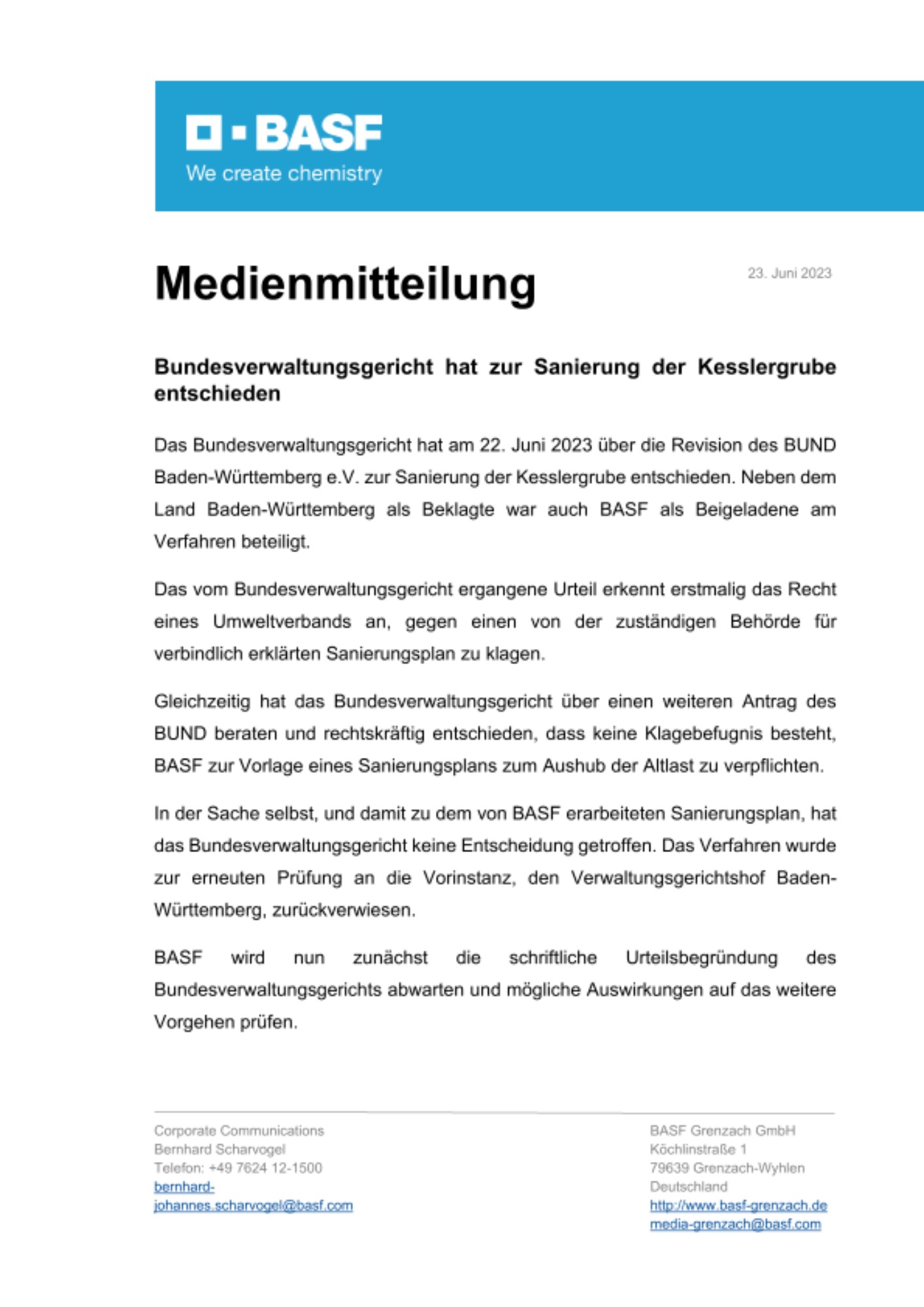 BASF wird nun zunächst die schriftliche Urteilsbegründung des Bundesverwaltungsgerichts abwarten und mögliche Auswirkungen auf das weitere Vorgehen prüfen.