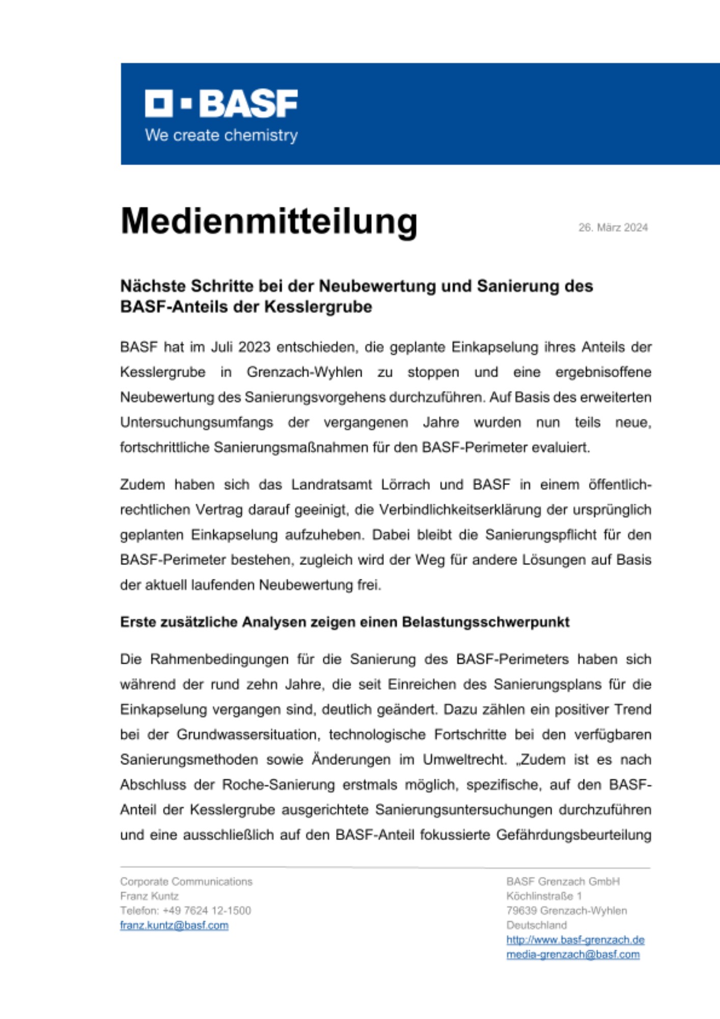 Die Sanierung des östlichen Teils der Kesslergrube in Grenzach-Wyhlen – rund 32.000 Quadratmeter und zwei Drittel der Gesamtfläche – liegt in der Verantwortung von BASF. Bei der Kesslergrube handelt es sich um eine Mischdeponie, die vor rund siebzig Jahren angelegt worden ist. Im BASF-Anteil der Kesslergrube wurde ein Volumen von circa zwei bis drei Prozent an Produktionsrückständen aus der chemisch-pharmazeutischen Industrie abgelagert. Vor rund zehn Jahren hat BASF einen Sanierungsplan zur Einkapselung ihres Anteils der Kesslergrube ausgearbeitet. Die vorgesehene Einkapselung wurde von den zuständigen Behörden geprüft und für verbindlich erklärt. Gegen diese Entscheidung haben der Umweltverband BUND Baden-Württemberg e.V., die Gemeinden Grenzach-Wyhlen, Riehen und Muttenz sowie die Baugenossenschaft Grenzach Rechtsmittel eingelegt. BASF hat die geplante Einkapselung zwischenzeitlich gestoppt und damit begonnen, das Vorgehen bei der Sanierung ihres Anteils der Kesslergrube neu zu bewerten.