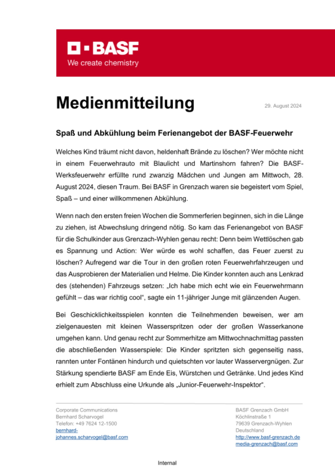 Welches Kind träumt nicht davon, heldenhaft Brände zu löschen? Wer möchte nicht in einem Feuerwehrauto mit Blaulicht und Martinshorn fahren? Die BASF-Werksfeuerwehr erfüllte rund zwanzig Mädchen und Jungen am Mittwoch, 28. August 2024, diesen Traum. Bei BASF in Grenzach waren sie begeistert vom Spiel, Spaß – und einer willkommenen Abkühlung.