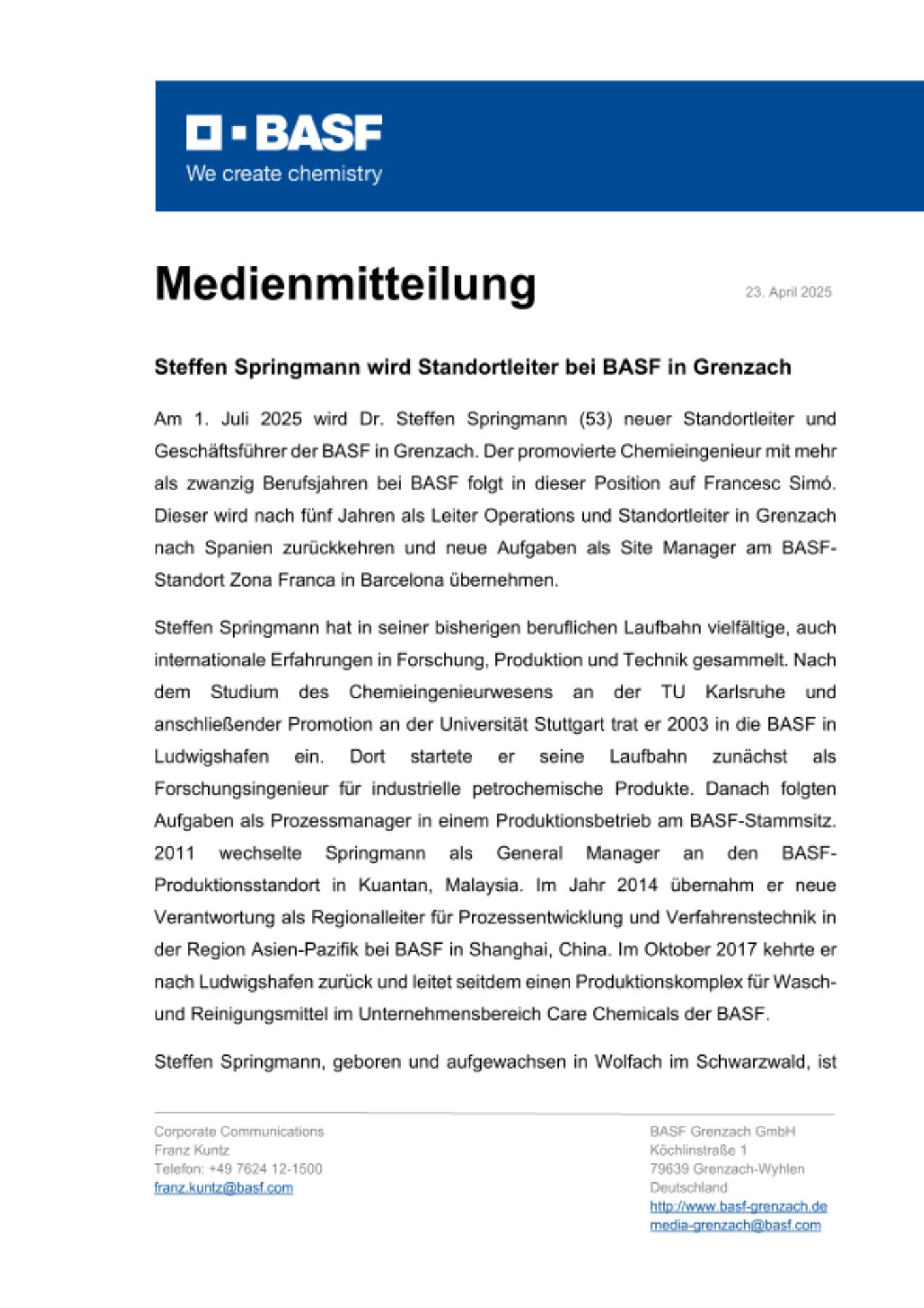 Am 1. Juli 2025 wird Dr. Steffen Springmann (53) neuer Standortleiter und Geschäftsführer der BASF in Grenzach. Der promovierte Chemieingenieur mit mehr als zwanzig Berufsjahren bei BASF folgt in dieser Position auf Francesc Simó. Dieser wird nach fünf Jahren als Leiter Operations und Standortleiter in Grenzach nach Spanien zurückkehren und neue Aufgaben als Site Manager am BASF-Standort Zona Franca in Barcelona übernehmen.