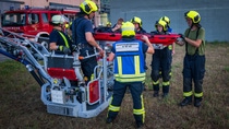 Dass nach einer Verpuffung Erdgas austritt und Folgebrände verursacht – dieses anspruchsvolle Szenario haben die freiwillige Feuerwehr Grenzach-Wyhlen und die BASF-Werkfeuerwehr am Mittwochabend, 2. Juli 2025, in einer Gemeinschaftsübung bewältigt. Mehr als 45 Feuerwehrleute mussten in einem mehrstöckigen Gebäude Brandherde bekämpfen, nach eingeschlossenen Personen suchen und sie über das 18 Meter hohe Dach mit Drehleitern aus der Gefahrenzone bringen – und das bei hochsommerlichen Temperaturen.