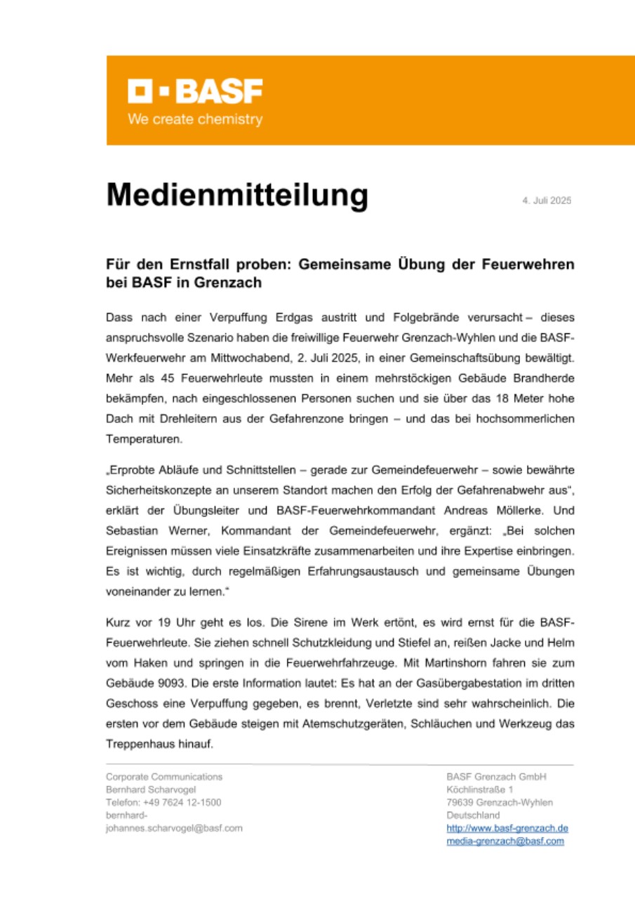 Im Verlauf der Übung suchen die verschiedenen Feuerwehr-Teams im Gebäude nach Vermissten und Verletzten, stoppen die Gaszufuhr, löschen Brandherde und sichern weitere Gebäudeteile. Etwas mehr als eine Stunde nach dem Alarm ist das Ereignis unter Kontrolle. „Wir sind mit dem Ablauf und dem Ergebnis der Übung sehr zufrieden“, zieht Übungsleiter Andreas Möllerke Bilanz. Auch Steffen Springmann, seit Juli neuer Standortleiter von BASF in Grenzach, überzeugte sich vor Ort von der Leistungsfähigkeit der Einsatzkräfte: „Ich bin sehr beeindruckt davon, wie unsere Werkfeuerwehr mit den Teams der Gemeinde zusammenarbeitet. Das ist ein wichtiges Element für die Sicherheit und den Schutz der Mitarbeitenden und Nachbarn in Grenzach.“