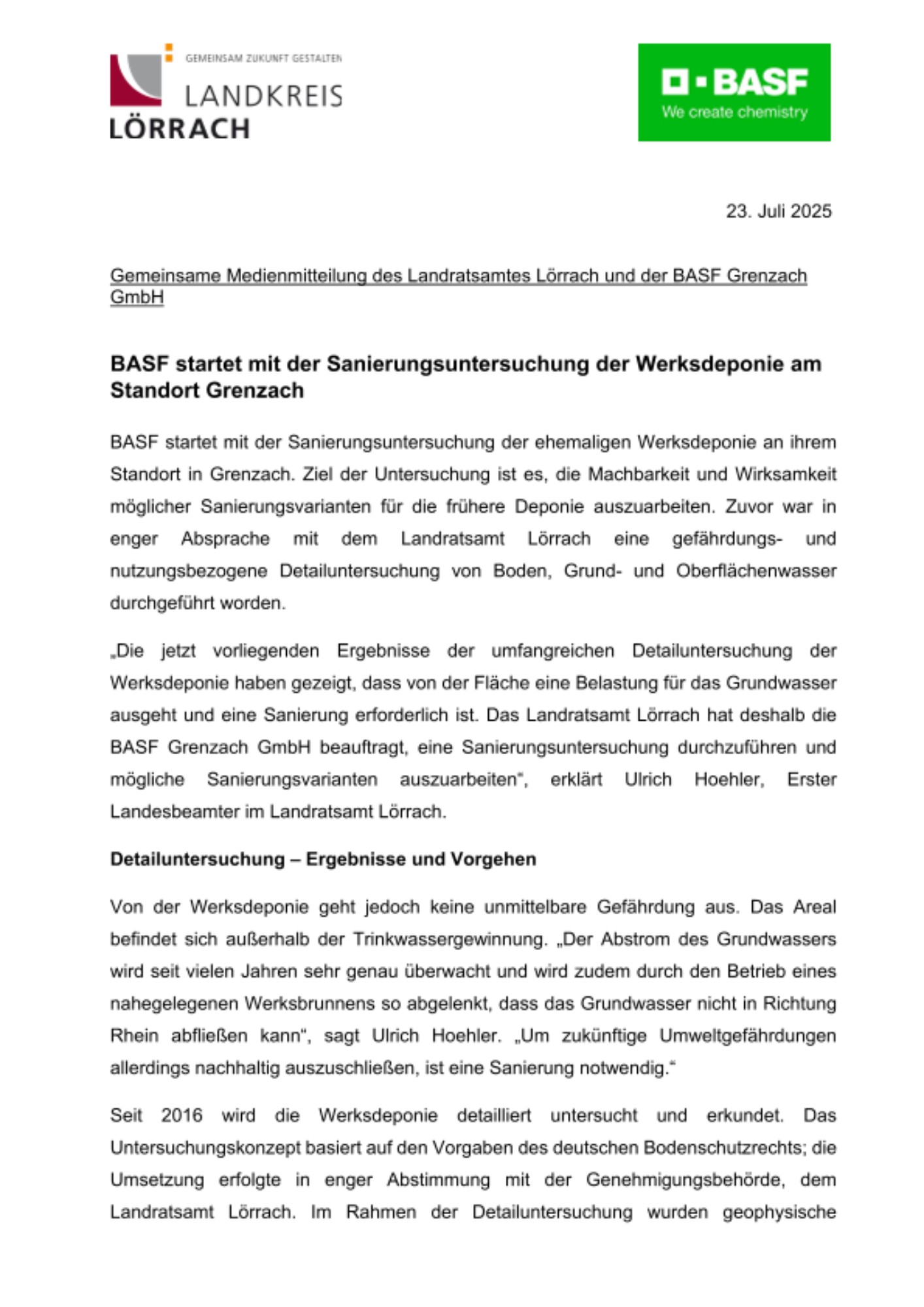 „Die jetzt vorliegenden Ergebnisse der umfangreichen Detailuntersuchung der Werksdeponie haben gezeigt, dass von der Fläche eine Belastung für das Grundwasser ausgeht und eine Sanierung erforderlich ist. Das Landratsamt Lörrach hat deshalb die BASF Grenzach GmbH beauftragt, eine Sanierungsuntersuchung durchzuführen und mögliche Sanierungsvarianten auszuarbeiten“, erklärt Ulrich Hoehler, Erster Landesbeamter im Landratsamt Lörrach.