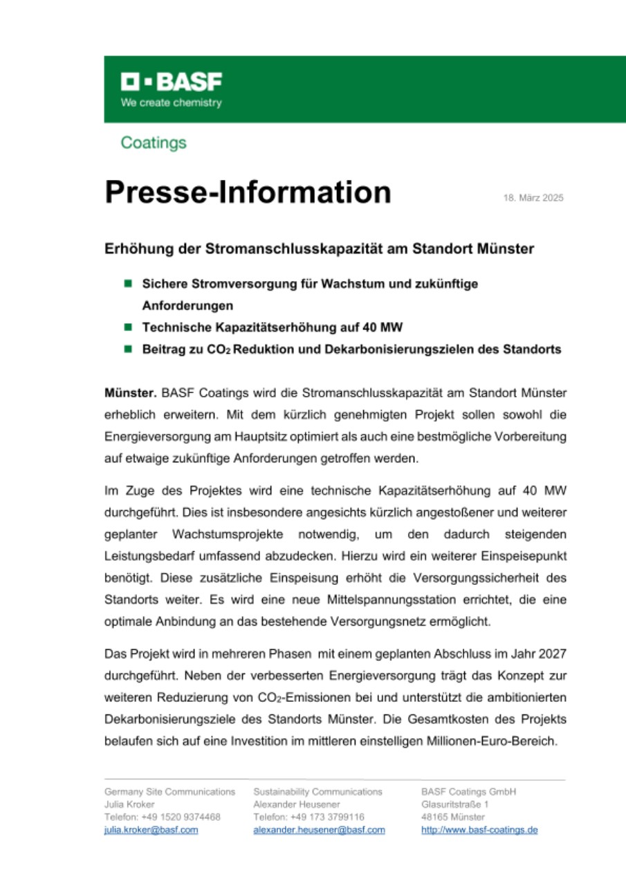 „Die Erhöhung der Stromanschlusskapazität ist ein wichtiger Schritt, um die zukünftigen Energieanforderungen unseres Standorts zu erfüllen und gleichzeitig unsere Nachhaltigkeitsziele zu unterstützen. Dieses Projekt zeigt unser Engagement für eine effiziente und umweltfreundliche Energieversorgung", unterstreicht Wolfram Schier, Standortleiter von BASF Coatings in Münster.