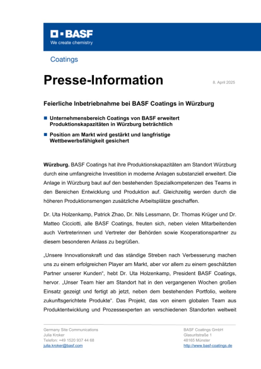 - Unternehmensbereich Coatings von BASF erweitert Produktionskapazitäten in Würzburg beträchtlich