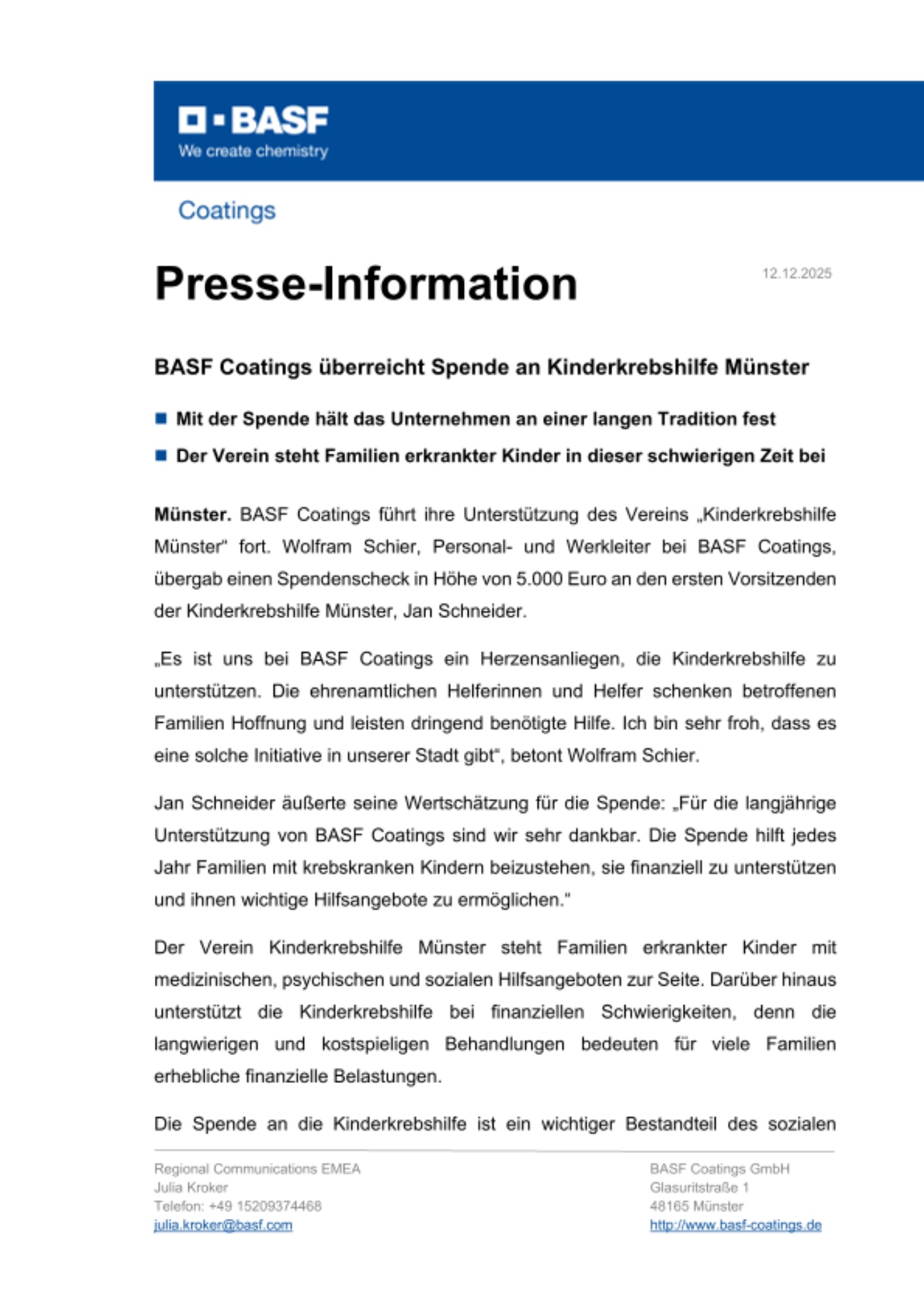 Die Spende an die Kinderkrebshilfe ist ein wichtiger Bestandteil des sozialen Engagements von BASF Coatings in der Region. Bereits im Sommer spendete das Unternehmen im Rahmen eines Spendenlaufs 2.150 Euro an den Verein. Diese Unterstützung fließt gleichzeitig auch in die Forschung im Bereich zukunftsorientierter Therapien und Behandlungen, um erkrankten Kindern die beste Hilfe zu ermöglichen.