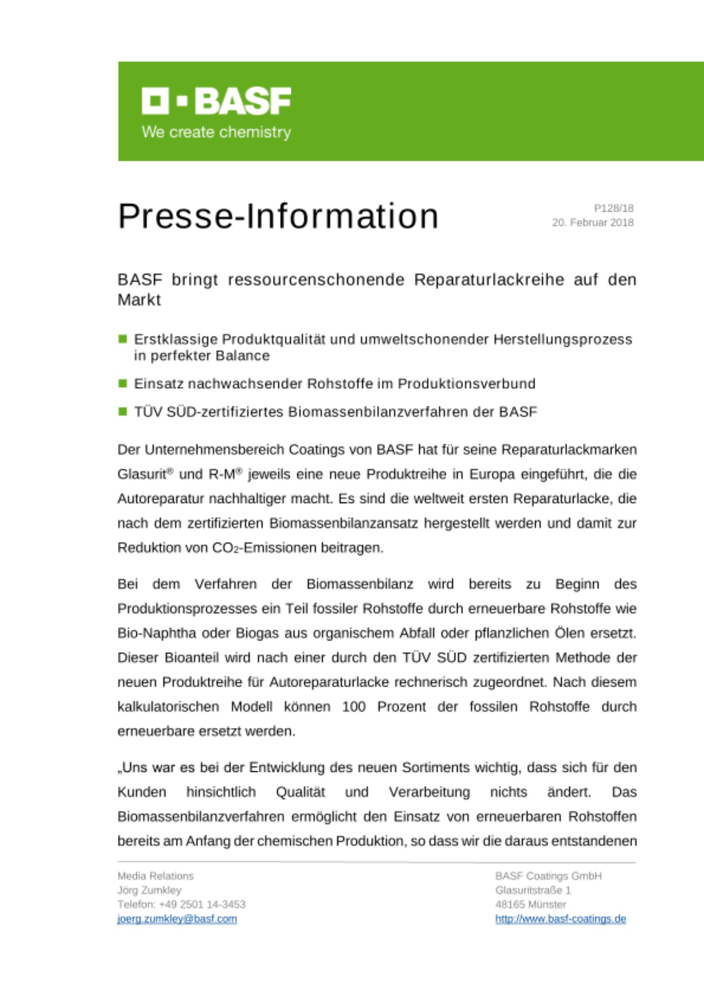 Der Unternehmensbereich Coatings von BASF hat für seine Reparaturlackmarken Glasurit® und R-M® jeweils eine neue Produktreihe in Europa eingeführt, die die Autoreparatur nachhaltiger macht. Es sind die weltweit ersten Reparaturlacke, die nach dem zertifizierten Biomassenbilanzansatz hergestellt werden und damit zur Reduktion von CO2-Emissionen beitragen.