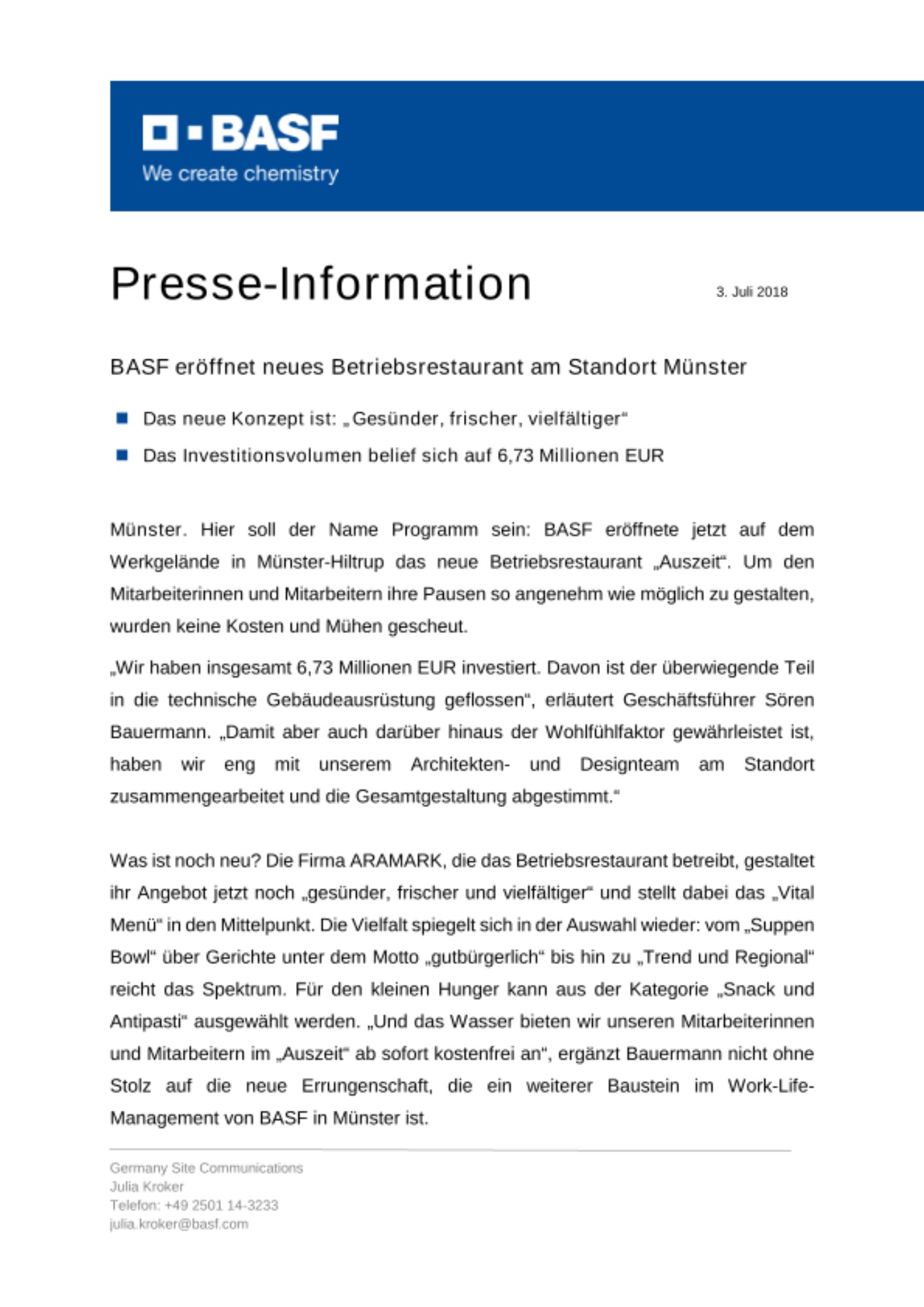 BASF eröffnet neues Betriebsrestaurant am Standort Münster