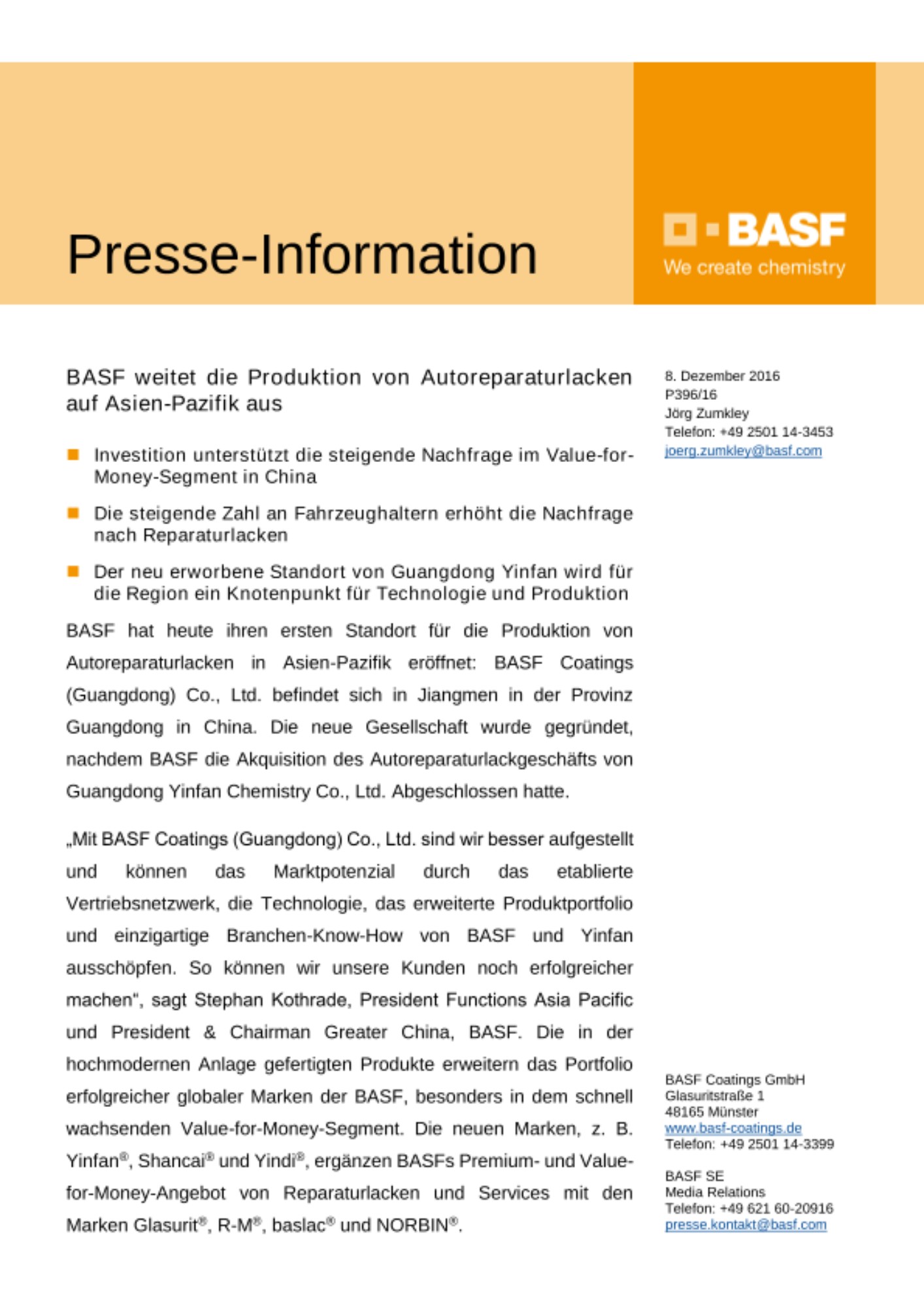 „Mit BASF Coatings (Guangdong) Co., Ltd. sind wir besser aufgestellt und können das Marktpotenzial durch das etablierte Vertriebsnetzwerk, die Technologie, das erweiterte Produktportfolio und einzigartige Branchen-Know-How von BASF und Yinfan ausschöpfen. So können wir unsere Kunden noch erfolgreicher machen“, sagt Stephan Kothrade, President Functions Asia Pacific und President & Chairman Greater China, BASF. Die in der hochmodernen Anlage gefertigten Produkte erweitern das Portfolio erfolgreicher globaler Marken der BASF, besonders in dem schnell wachsenden Value-for-Money-Segment. Die neuen Marken, z. B. Yinfan®, Shancai® und Yindi®, ergänzen BASFs Premium- und Value-for-Money-Angebot von Reparaturlacken und Services mit den Marken Glasurit®, R-M®, baslac® und NORBIN®.