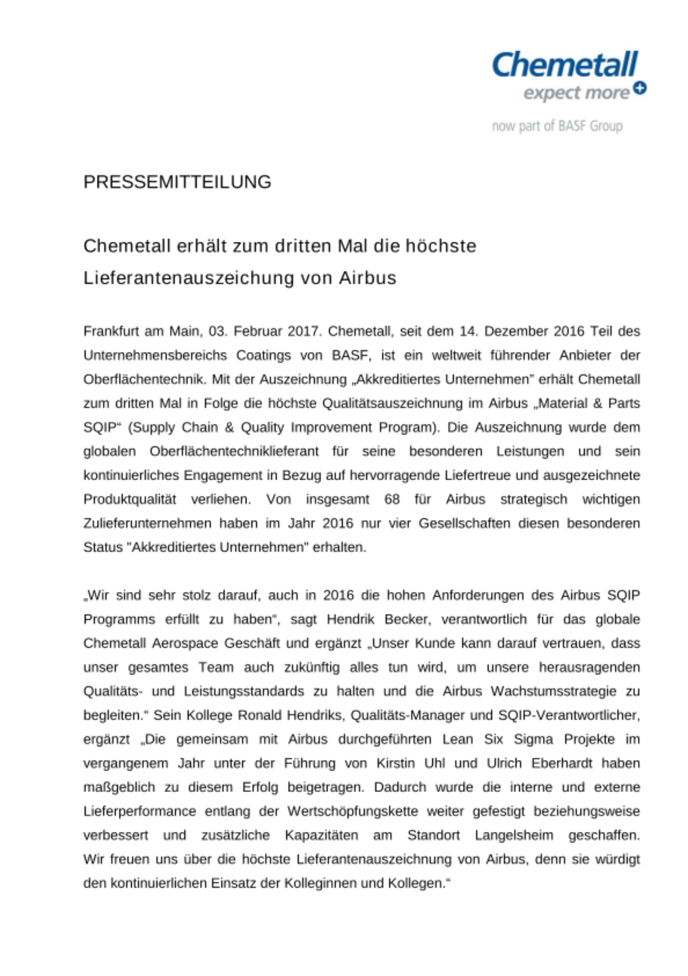 Frankfurt am Main, 03. Februar 2017. Chemetall, seit dem 14. Dezember 2016 Teil des Unternehmensbereichs Coatings von BASF, ist ein weltweit führender Anbieter der Oberflächentechnik. Mit der Auszeichnung „Akkreditiertes Unternehmen” erhält Chemetall zum dritten Mal in Folge die höchste Qualitätsauszeichnung im Airbus „Material & Parts SQIP“ (Supply Chain & Quality Improvement Program). Die Auszeichnung wurde dem globalen Oberflächentechniklieferant für seine besonderen Leistungen und sein kontinuierliches Engagement in Bezug auf hervorragende Liefertreue und ausgezeichnete Produktqualität verliehen. Von insgesamt 68 für Airbus strategisch wichtigen Zulieferunternehmen haben im Jahr 2016 nur vier Gesellschaften diesen besonderen Status "Akkreditiertes Unternehmen" erhalten.