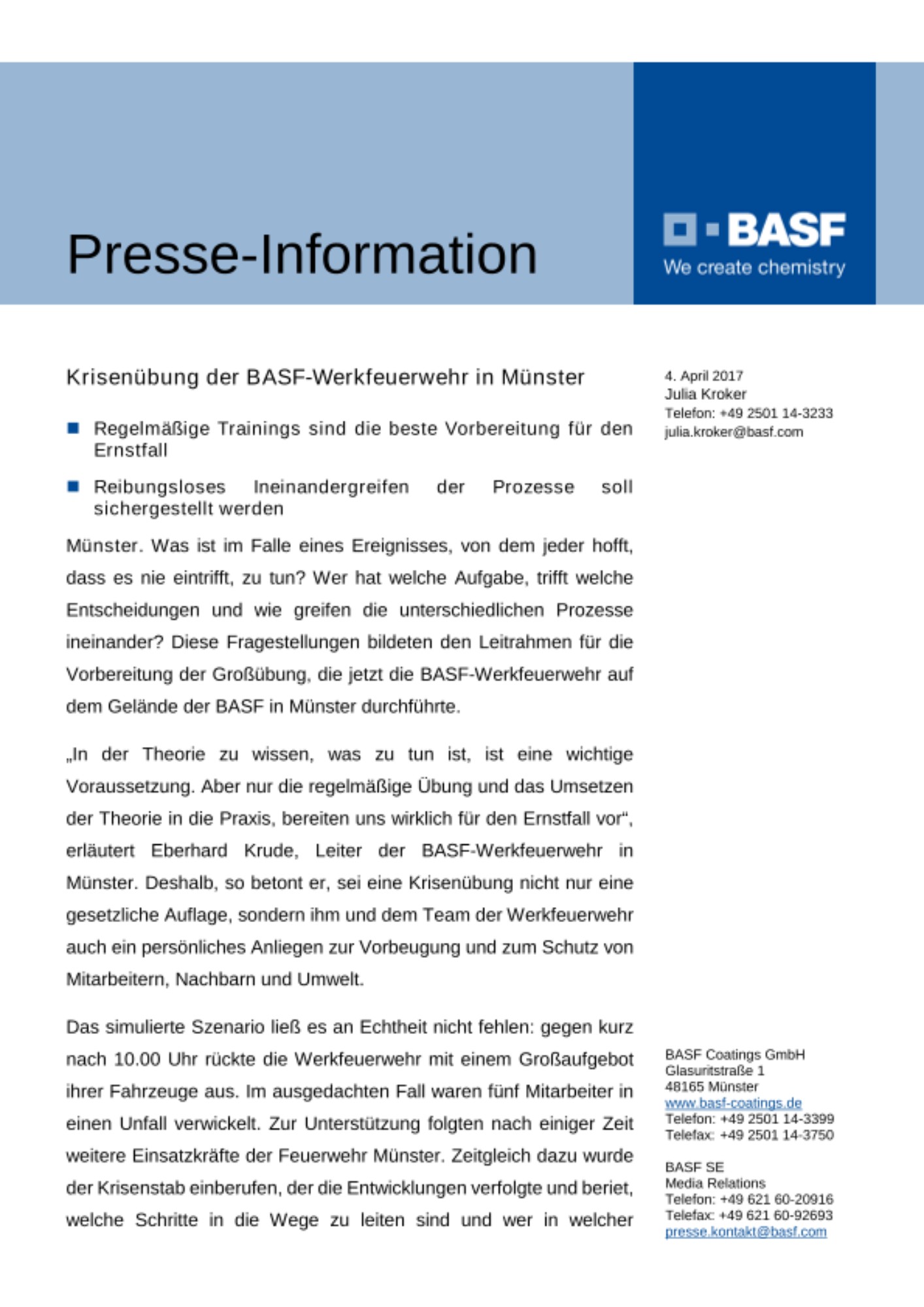 „In der Theorie zu wissen, was zu tun ist, ist eine wichtige Voraussetzung. Aber nur die regelmäßige Übung und das Umsetzen der Theorie in die Praxis, bereiten uns wirklich für den Ernstfall vor“, erläutert Eberhard Krude, Leiter der BASF-Werkfeuerwehr in Münster. Deshalb, so betont er, sei eine Krisenübung nicht nur eine gesetzliche Auflage, sondern ihm und dem Team der Werkfeuerwehr auch ein persönliches Anliegen zur Vorbeugung und zum Schutz von Mitarbeitern, Nachbarn und Umwelt.