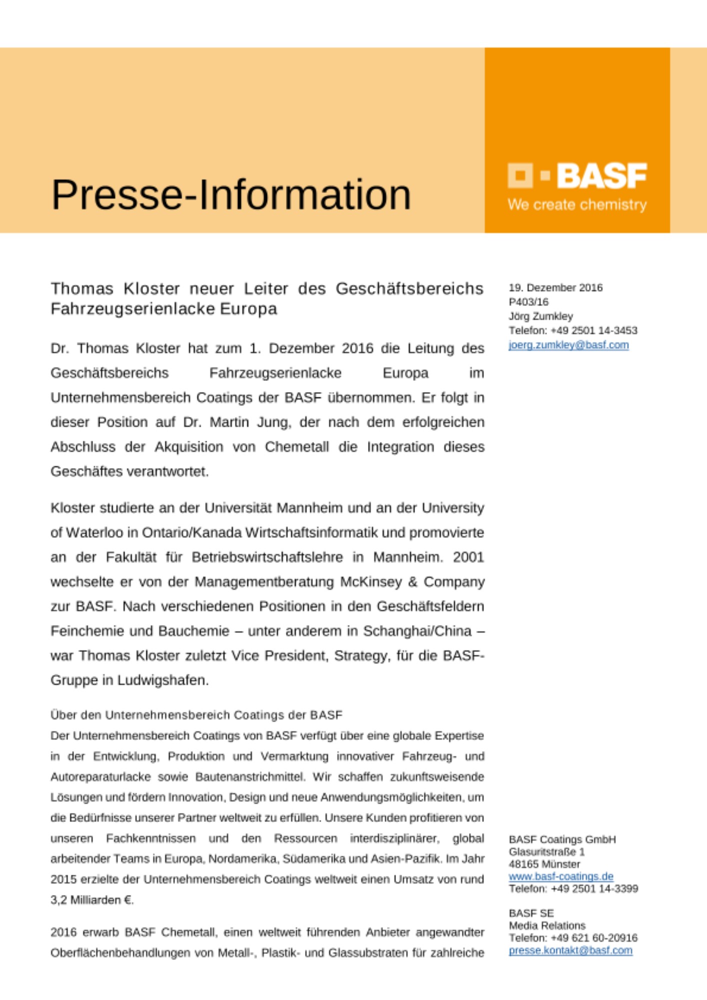 Dr. Thomas Kloster hat zum 1. Dezember 2016 die Leitung des Geschäftsbereichs Fahrzeugserienlacke Europa im Unternehmensbereich Coatings der BASF übernommen. Er folgt in dieser Position auf Dr. Martin Jung, der nach dem erfolgreichen Abschluss der Akquisition von Chemetall die Integration dieses Geschäftes verantwortet.