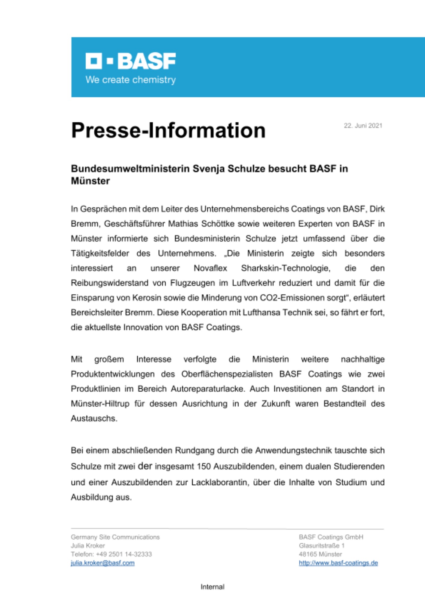 In Gesprächen mit dem Leiter des Unternehmensbereichs Coatings von BASF, Dirk Bremm, Geschäftsführer Mathias Schöttke sowie weiteren Experten von BASF in Münster informierte sich Bundesministerin Schulze jetzt umfassend über die Tätigkeitsfelder des Unternehmens. „Die Ministerin zeigte sich besonders interessiert an unserer Novaflex Sharkskin-Technologie, die den Reibungswiderstand von Flugzeugen im Luftverkehr reduziert und damit für die Einsparung von Kerosin sowie die Minderung von CO2-Emissionen sorgt“, erläutert Bereichsleiter Bremm. Diese Kooperation mit Lufthansa Technik sei, so fährt er fort, die aktuellste Innovation von BASF Coatings.