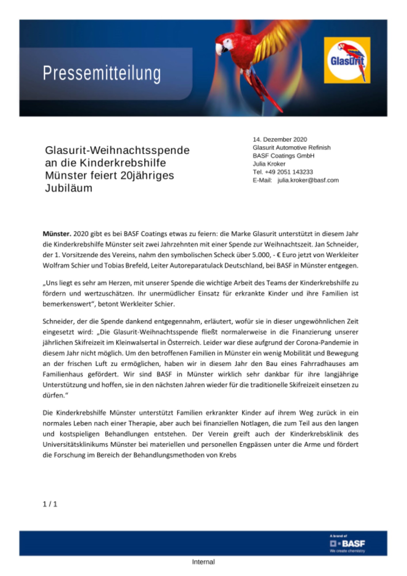 Münster. 2020 gibt es bei BASF Coatings etwas zu feiern: die Marke Glasurit unterstützt in diesem Jahr die Kinderkrebshilfe Münster seit zwei Jahrzehnten mit einer Spende zur Weihnachtszeit. Jan Schneider, der 1. Vorsitzende des Vereins, nahm den symbolischen Scheck über 5.000, - € Euro jetzt von Werkleiter Wolfram Schier und Tobias Brefeld, Leiter Autoreparatulack Deutschland, bei BASF in Münster entgegen.