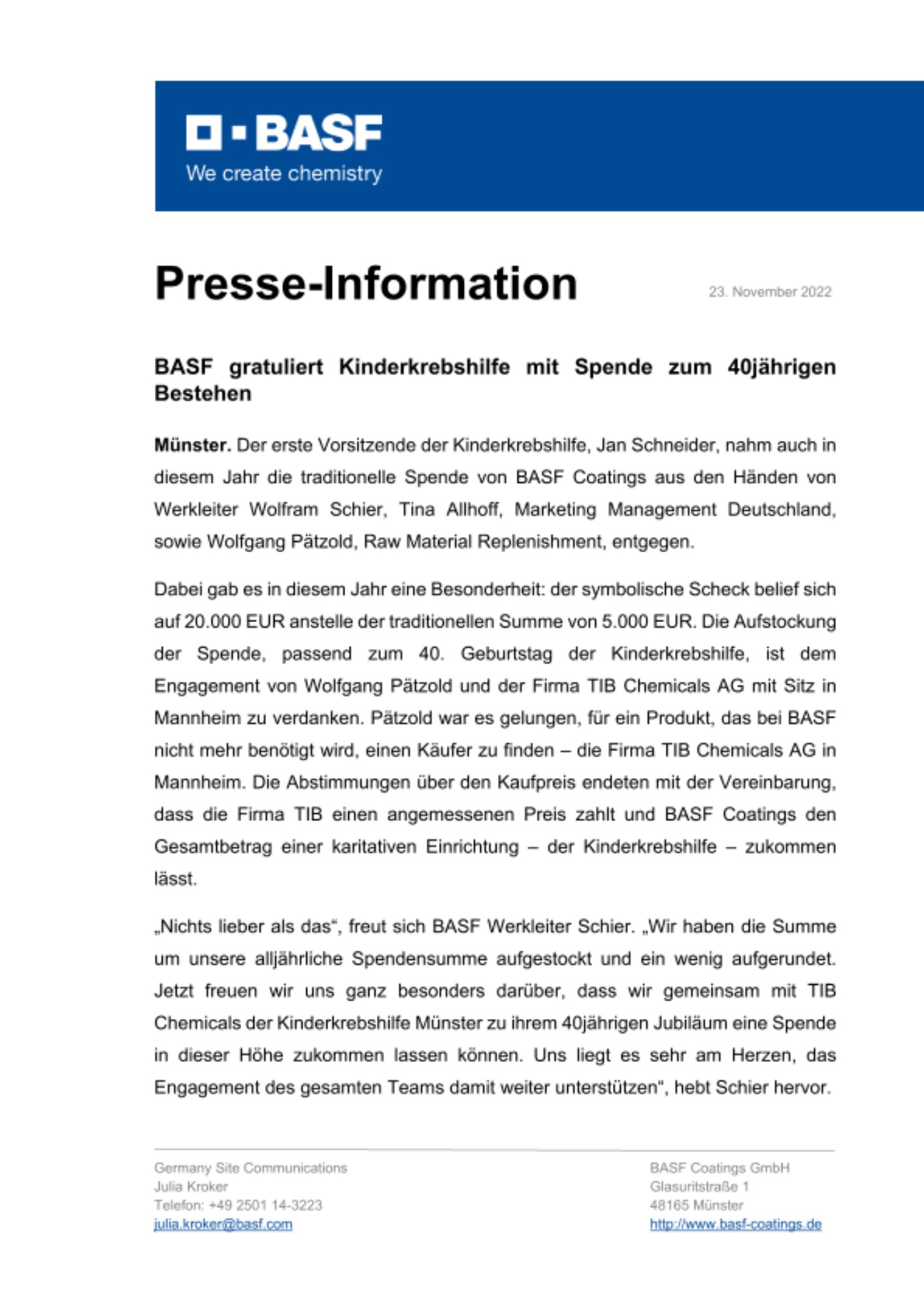 „Nichts lieber als das“, freut sich BASF Werkleiter Schier. „Wir haben die Summe um unsere alljährliche Spendensumme aufgestockt und ein wenig aufgerundet. Jetzt freuen wir uns ganz besonders darüber, dass wir gemeinsam mit TIB Chemicals der Kinderkrebshilfe Münster zu ihrem 40jährigen Jubiläum eine Spende in dieser Höhe zukommen lassen können. Uns liegt es sehr am Herzen, das Engagement des gesamten Teams damit weiter unterstützen“, hebt Schier hervor.