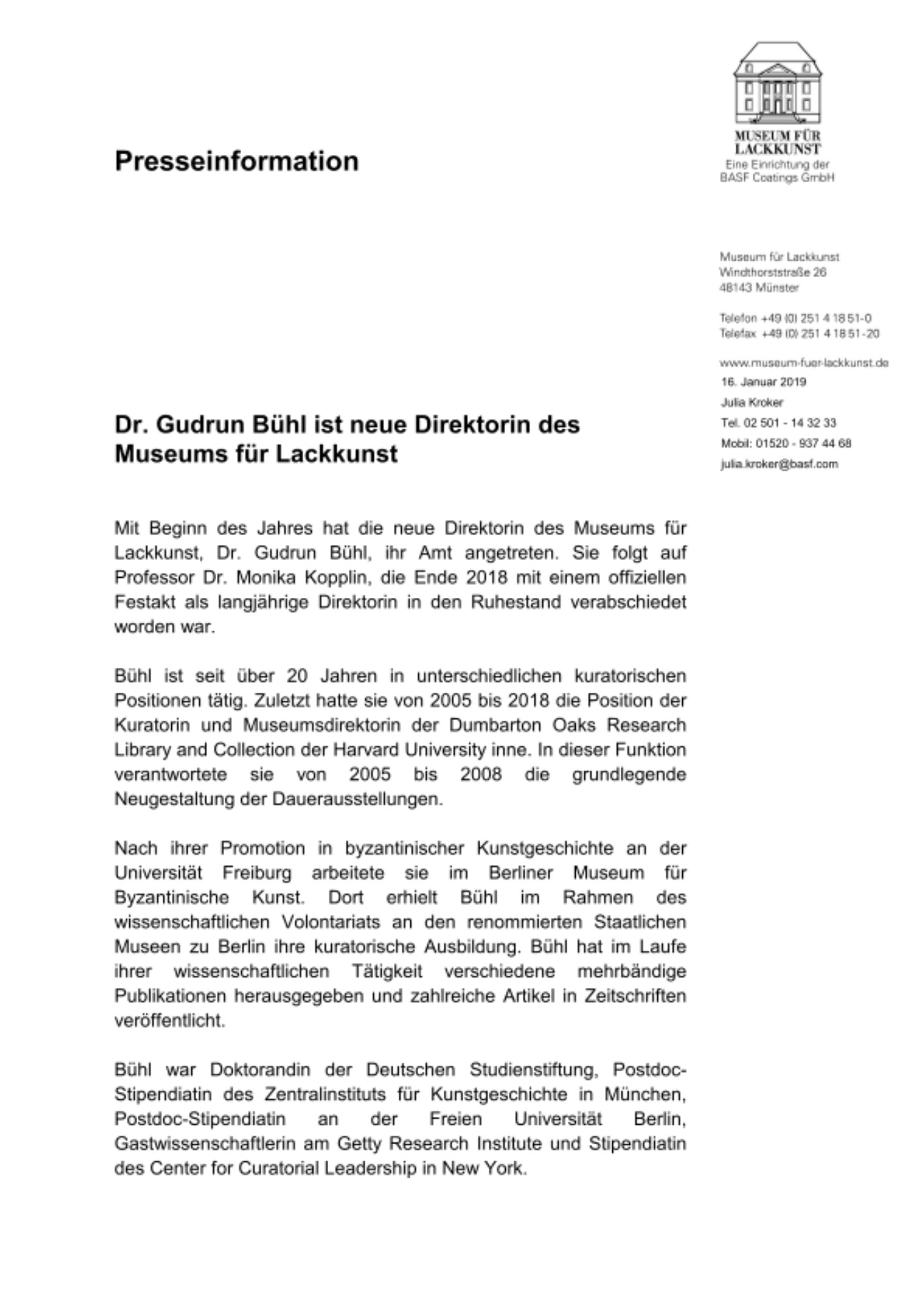 Mit Beginn des Jahres hat die neue Direktorin des Museums für Lackkunst, Dr. Gudrun Bühl, ihr Amt angetreten. Sie folgt auf Professor Dr. Monika Kopplin, die Ende 2018 mit einem offiziellen Festakt als langjährige Direktorin in den Ruhestand verabschiedet worden war.