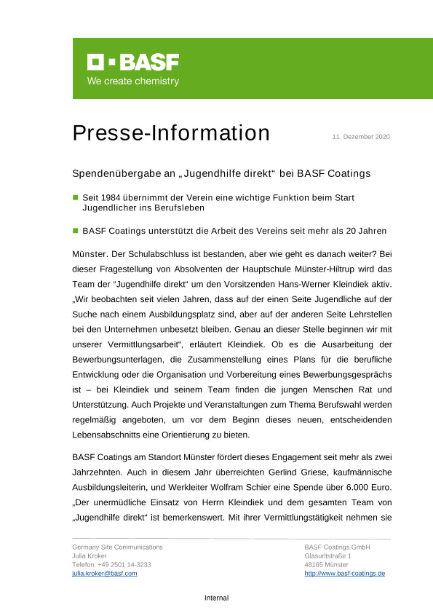 BASF Coatings am Standort Münster fördert dieses Engagement seit mehr als zwei Jahrzehnten. Auch in diesem Jahr überreichten Gerlind Griese, kaufmännische Ausbildungsleiterin, und Werkleiter Wolfram Schier eine Spende über 6.000 Euro. „Der unermüdliche Einsatz von Herrn Kleindiek und dem gesamten Team von „Jugendhilfe direkt“ ist bemerkenswert. Mit ihrer Vermittlungstätigkeit nehmen sie eine wichtige Funktion auf dem Weg der Jugendlichen ins Berufsleben wahr. Wir freuen uns sehr, den Verein auch in diesem Jahr zu unterstützen und die Zusammenarbeit fortzusetzen“, hebt Schier hervor.