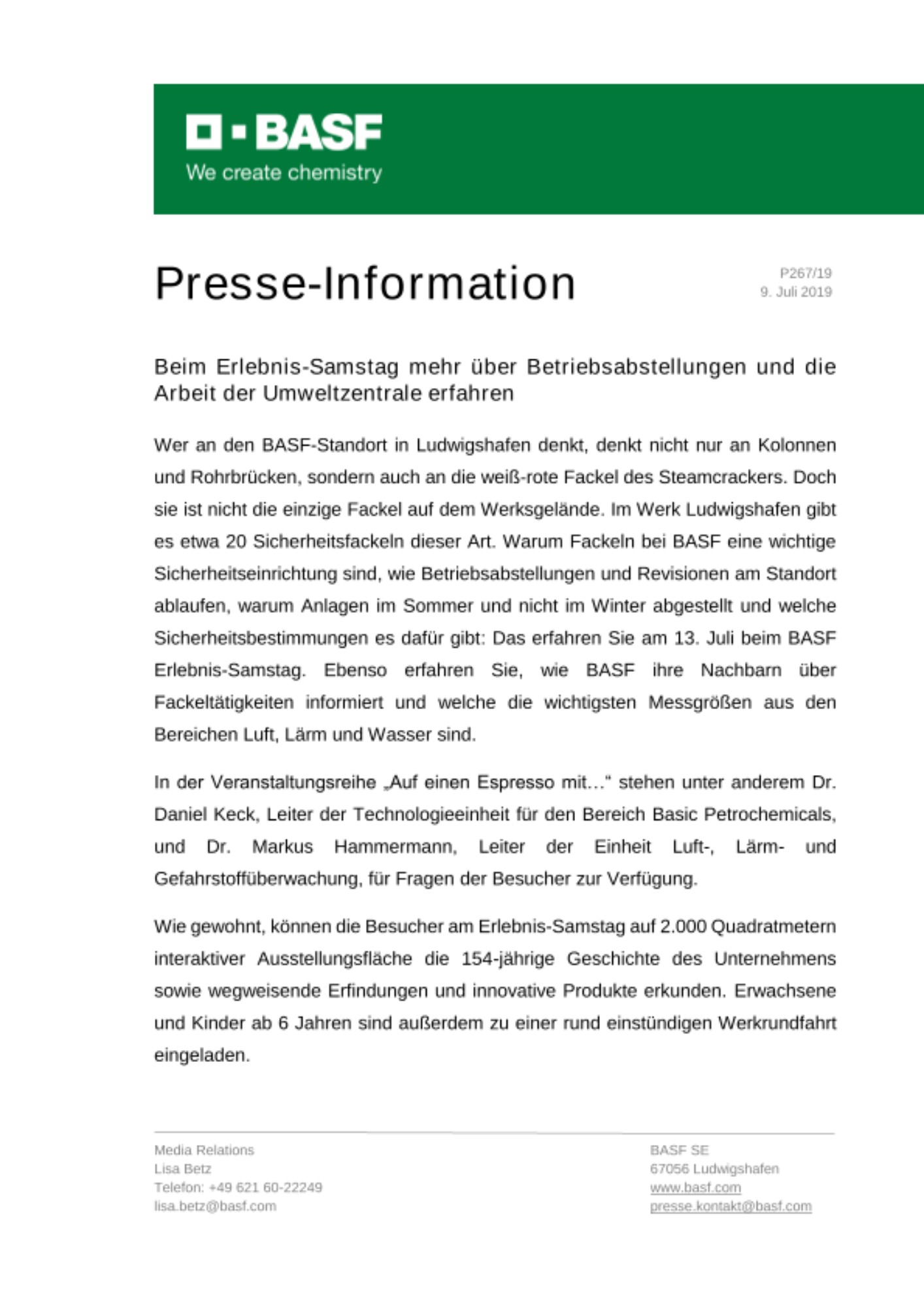 Wer an den BASF-Standort in Ludwigshafen denkt, denkt nicht nur an Kolonnen und Rohrbrücken, sondern auch an die weiß-rote Fackel des Steamcrackers. Doch sie ist nicht die einzige Fackel auf dem Werksgelände. Im Werk Ludwigshafen gibt es etwa 20 Sicherheitsfackeln dieser Art. Warum Fackeln bei BASF eine wichtige Sicherheitseinrichtung sind, wie Betriebsabstellungen und Revisionen am Standort ablaufen, warum Anlagen im Sommer und nicht im Winter abgestellt und welche Sicherheitsbestimmungen es dafür gibt: Das erfahren Sie am 13. Juli beim BASF Erlebnis-Samstag. Ebenso erfahren Sie, wie BASF ihre Nachbarn über Fackeltätigkeiten informiert und welche die wichtigsten Messgrößen aus den Bereichen Luft, Lärm und Wasser sind.
