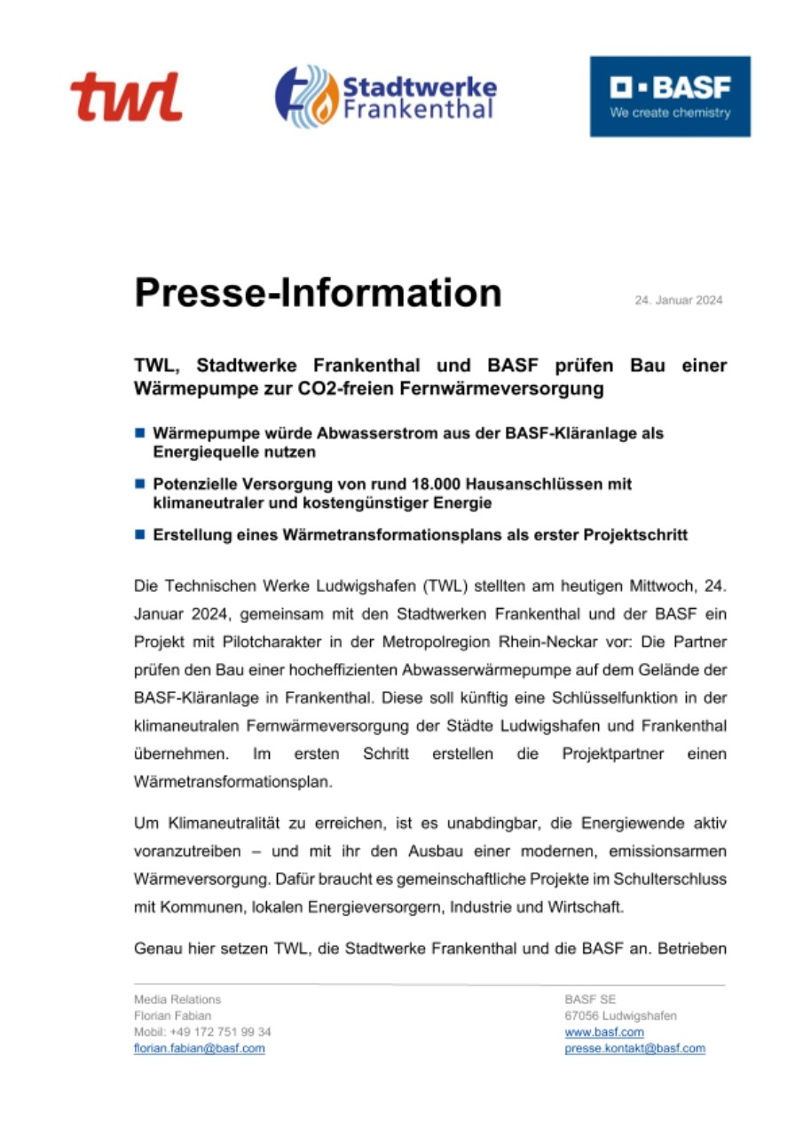 Die Technischen Werke Ludwigshafen (TWL) stellten am heutigen Mittwoch, 24. Januar 2024, gemeinsam mit den Stadtwerken Frankenthal und der BASF ein Projekt mit Pilotcharakter in der Metropolregion Rhein-Neckar vor: Die Partner prüfen den Bau einer hocheffizienten Abwasserwärmepumpe auf dem Gelände der BASF-Kläranlage in Frankenthal. Diese soll künftig eine Schlüsselfunktion in der klimaneutralen Fernwärmeversorgung der Städte Ludwigshafen und Frankenthal übernehmen. Im ersten Schritt erstellen die Projektpartner einen Wärmetransformationsplan.