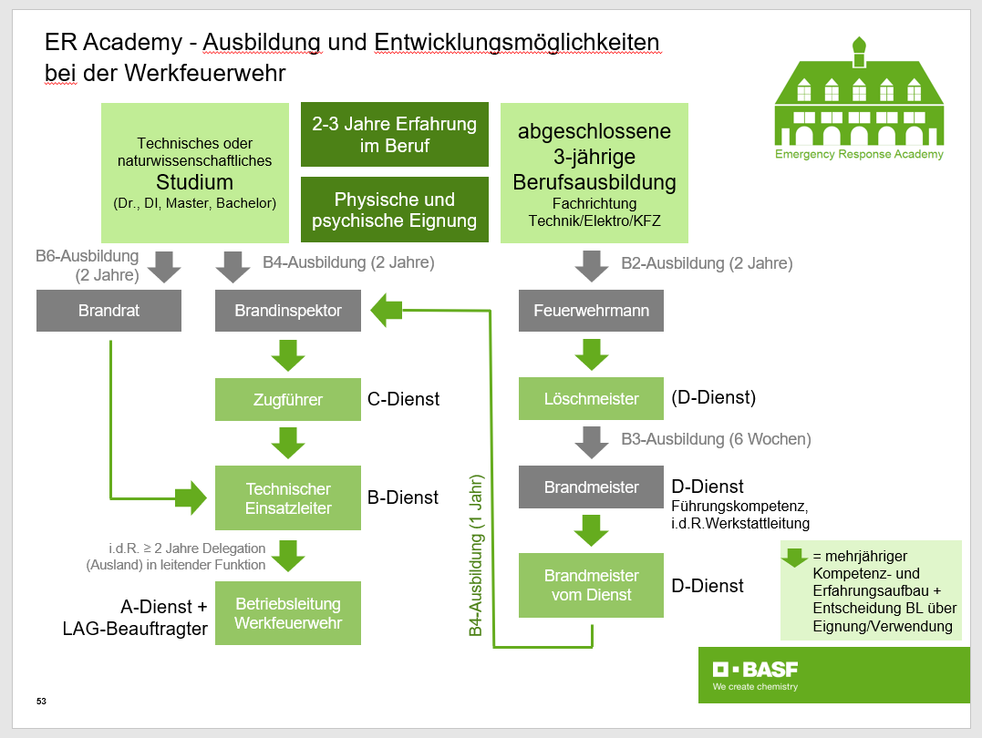 Die Ausbildung zum hauptberuflichen Werkfeuerwehrmann bei der BASF-Werkfeuerwehr dauert zwei Jahre. Nach dem sechsmonatigen Grundlehrgang werden die Auszubildenden für weitere eineinhalb Jahre im Schichtdienst auf einer der beiden Wachen der Werkfeuerwehr am Standort Ludwigshafen ausgebildet. Voraussetzung für eine Ausbildung bei der Werkfeuerwehr ist eine abgeschlossene Berufsausbildung, vorzugsweise im handwerklich-technischen Bereich. Außerdem müssen Bewerber körperlich und psychisch belastbar sein.