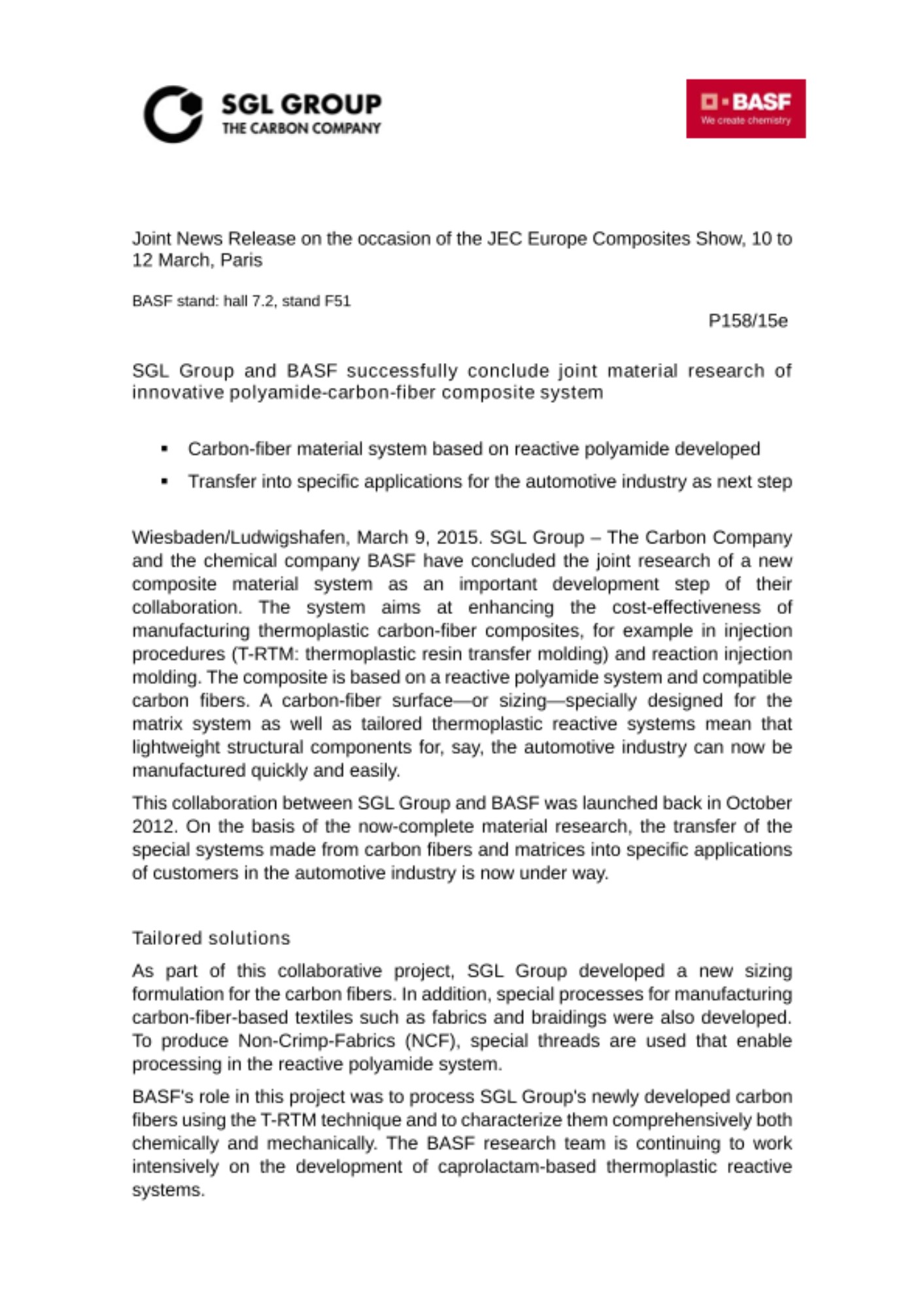 Wiesbaden/Ludwigshafen, March 9, 2015. SGL Group – The Carbon Company and the chemical company BASF have concluded the joint research of a new composite material system as an important development step of their collaboration. The system aims at enhancing the cost-effectiveness of manufacturing thermoplastic carbon-fiber composites, for example in injection procedures (T-RTM: thermoplastic resin transfer molding) and reaction injection molding. The composite is based on a reactive polyamide system and compatible carbon fibers. A carbon-fiber surface—or sizing—specially designed for the matrix system as well as tailored thermoplastic reactive systems mean that lightweight structural components for, say, the automotive industry can now be manufactured quickly and easily.