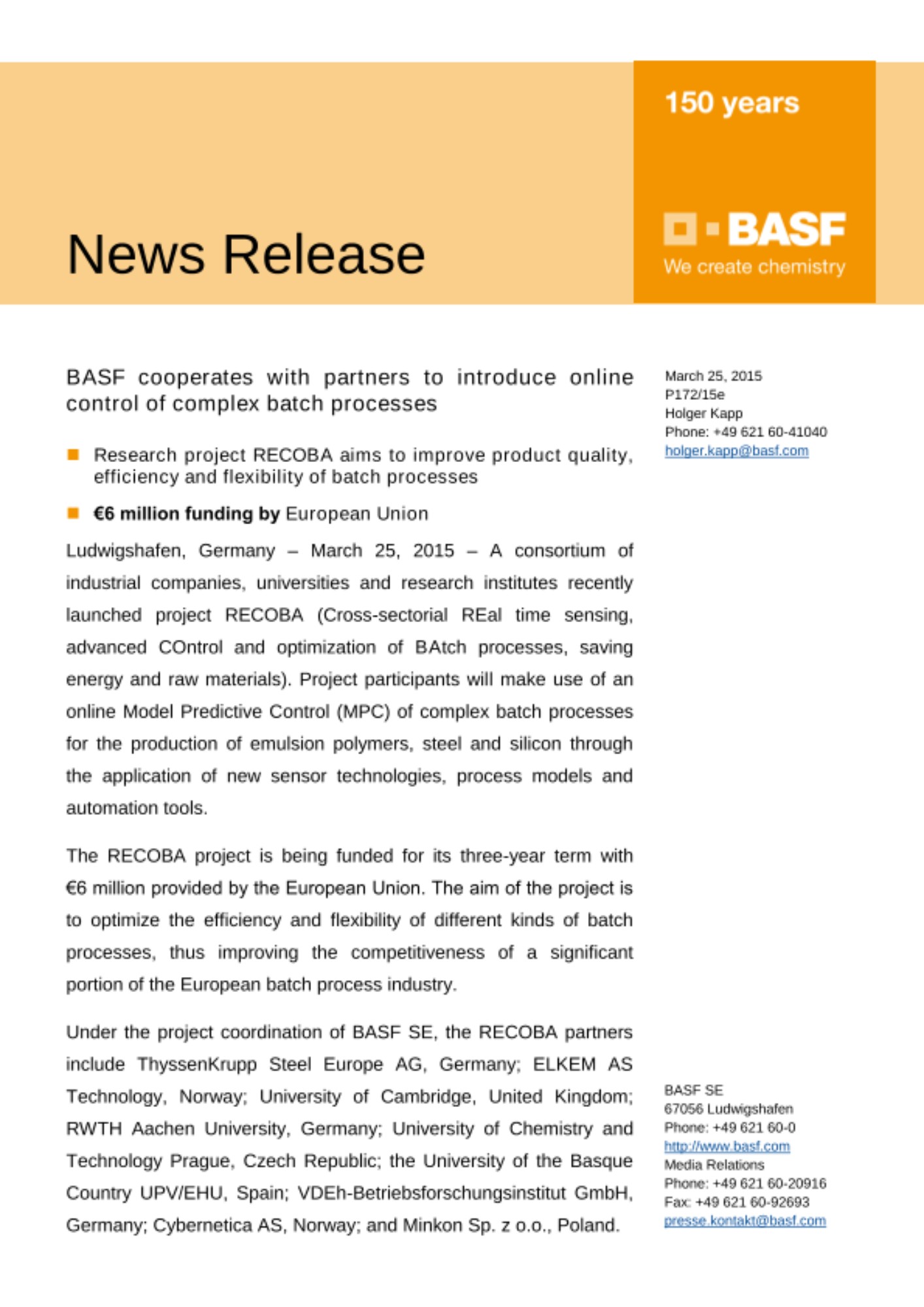 Ludwigshafen, Germany – March 25, 2015 – A consortium of industrial companies, universities and research institutes recently launched project RECOBA (Cross-sectorial REal time sensing, advanced COntrol and optimization of BAtch processes, saving energy and raw materials). Project participants will make use of an online Model Predictive Control (MPC) of complex batch processes for the production of emulsion polymers, steel and silicon through the application of new sensor technologies, process models and automation tools.