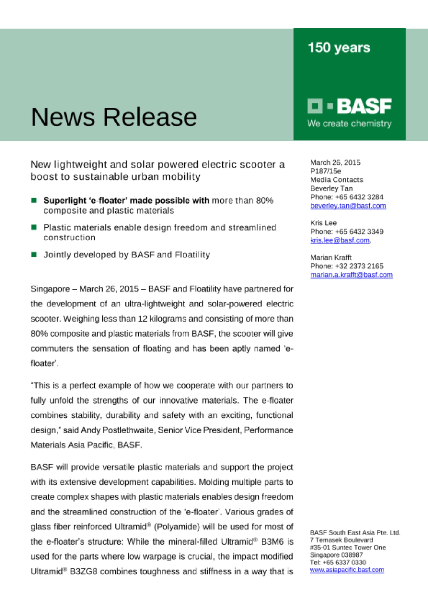 “This is a perfect example of how we cooperate with our partners to fully unfold the strengths of our innovative materials. The e-floater combines stability, durability and safety with an exciting, functional design,” said Andy Postlethwaite, Senior Vice President, Performance Materials Asia Pacific, BASF.