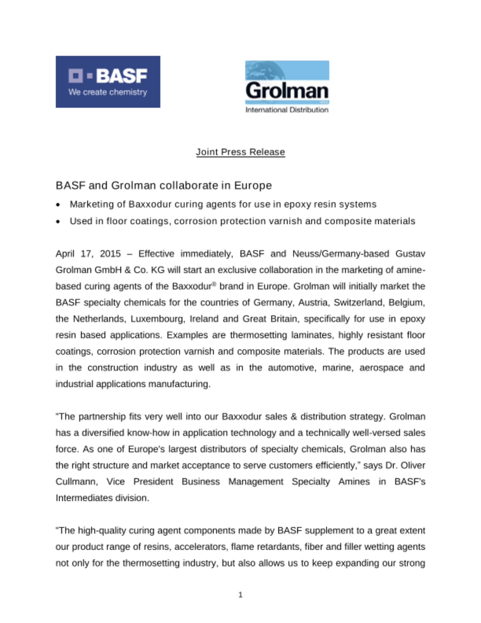 April 17, 2015 – Effective immediately, BASF and Neuss/Germany-based Gustav Grolman GmbH & Co. KG will start an exclusive collaboration in the marketing of amine-based curing agents of the Baxxodur® brand in Europe. Grolman will initially market the BASF specialty chemicals for the countries of Germany, Austria, Switzerland, Belgium, the Netherlands, Luxembourg, Ireland and Great Britain, specifically for use in epoxy resin based applications. Examples are thermosetting laminates, highly resistant floor coatings, corrosion protection varnish and composite materials. The products are used in the construction industry as well as in the automotive, marine, aerospace and industrial applications manufacturing.