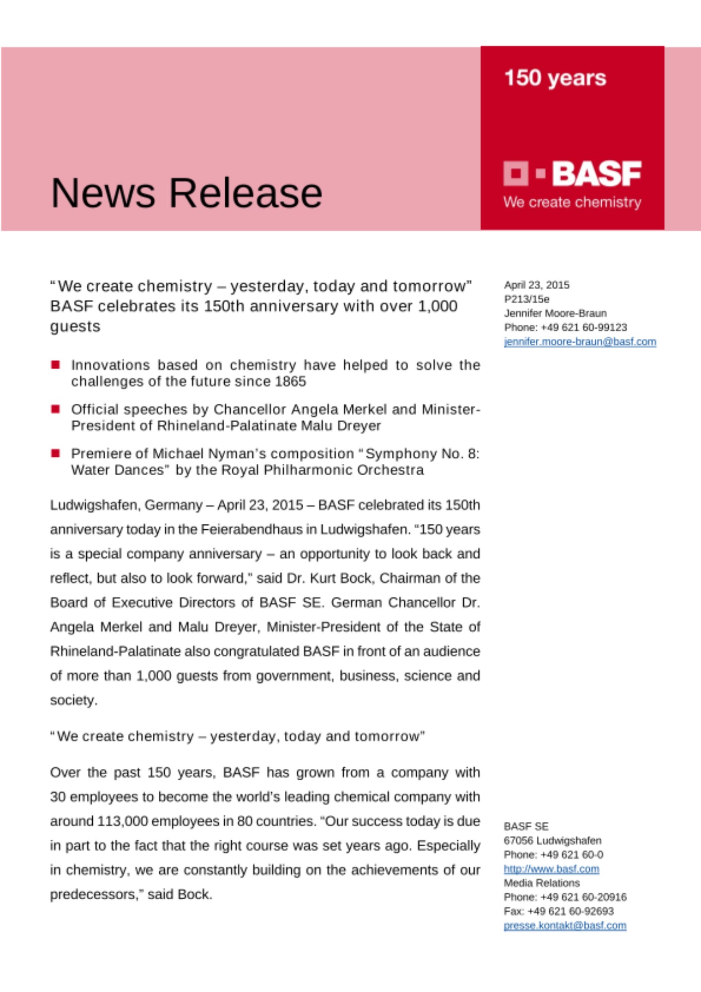 “We create chemistry – yesterday, today and tomorrow” BASF celebrates its 150th anniversary with over 1,000 guests