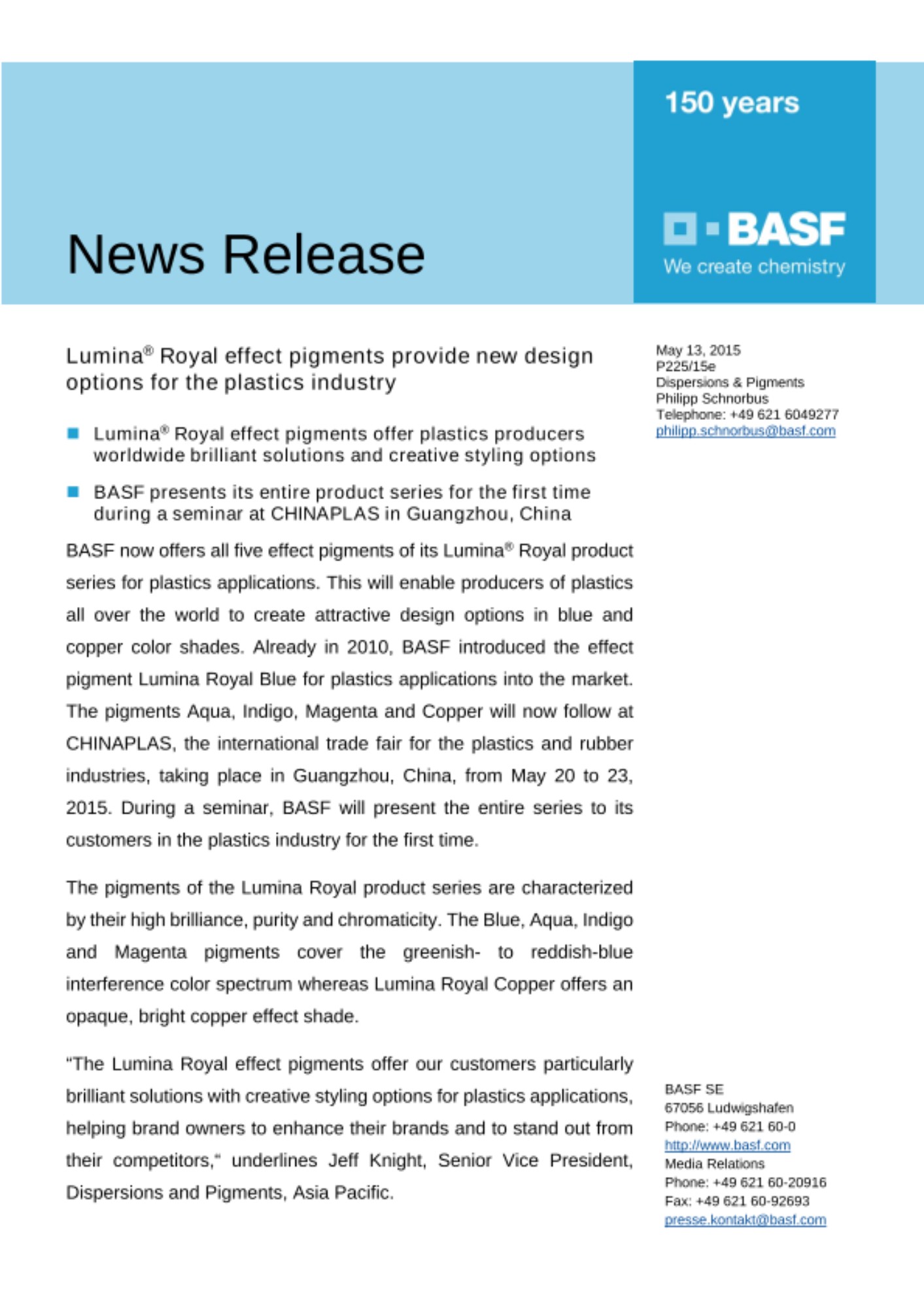 BASF now offers all five effect pigments of its Lumina® Royal product series for plastics applications. This will enable producers of plastics all over the world to create attractive design options in blue and copper color shades. Already in 2010, BASF introduced the effect pigment Lumina Royal Blue for plastics applications into the market. The pigments Aqua, Indigo, Magenta and Copper will now follow at CHINAPLAS, the international trade fair for the plastics and rubber industries, taking place in Guangzhou, China, from May 20 to 23, 2015. During a seminar, BASF will present the entire series to its customers in the plastics industry for the first time.