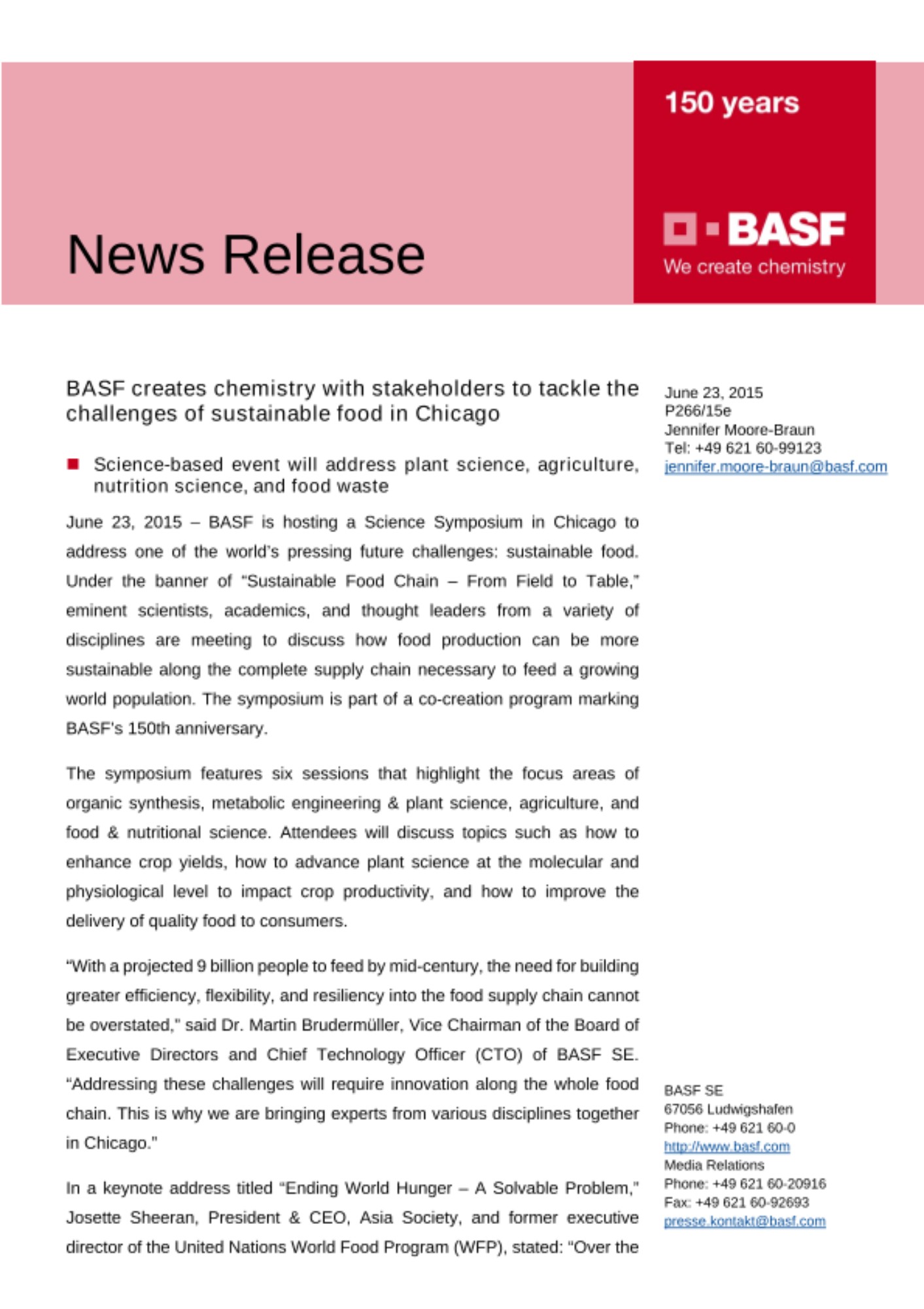 June 23, 2015 – BASF is hosting a Science Symposium in Chicago to address one of the world’s pressing future challenges: sustainable food. Under the banner of “Sustainable Food Chain – From Field to Table,” eminent scientists, academics, and thought leaders from a variety of disciplines are meeting to discuss how food production can be more sustainable along the complete supply chain necessary to feed a growing world population. The symposium is part of a co-creation program marking BASF’s 150th anniversary.