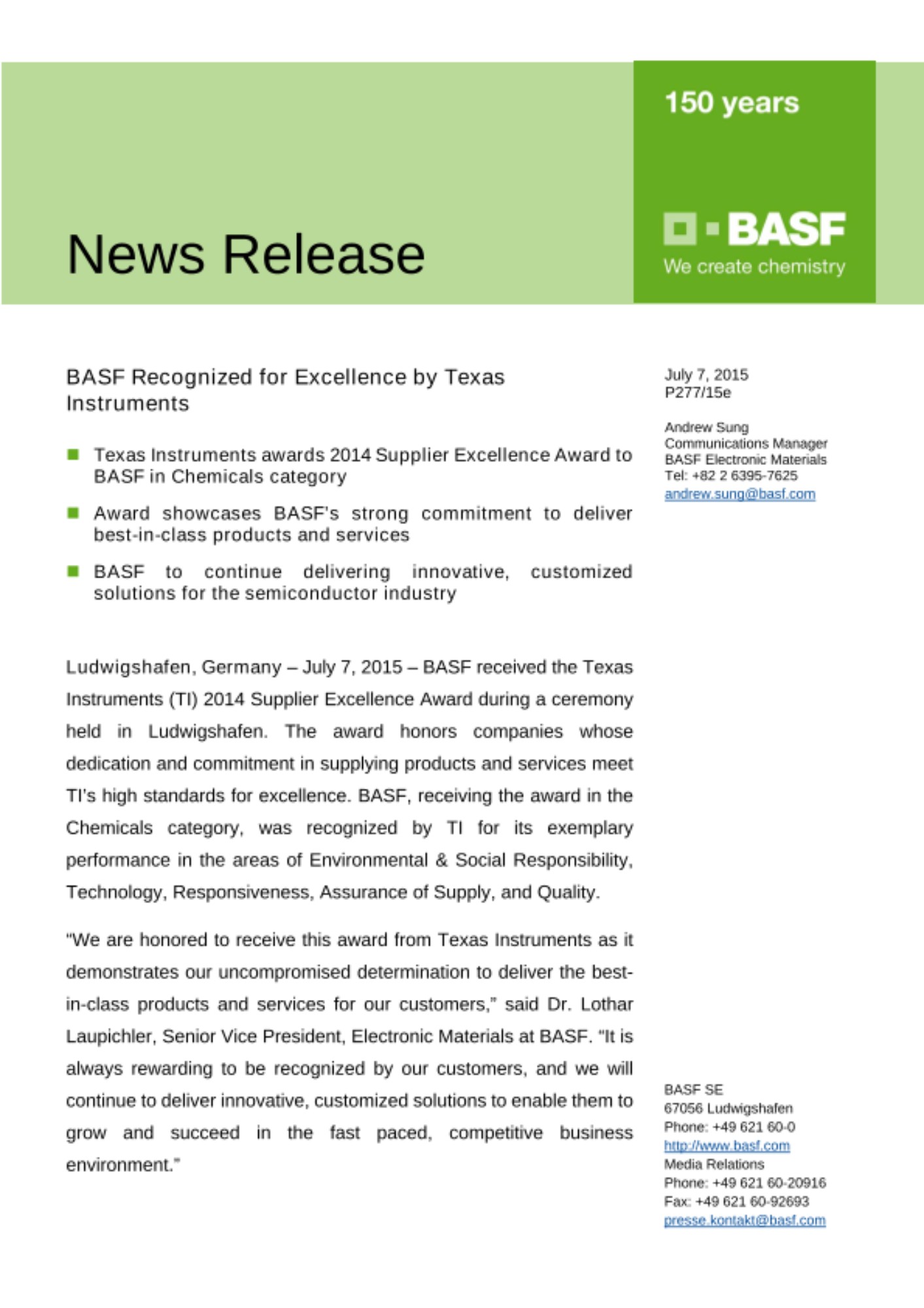 - Texas Instruments awards 2014 Supplier Excellence Award to BASF in Chemicals category
