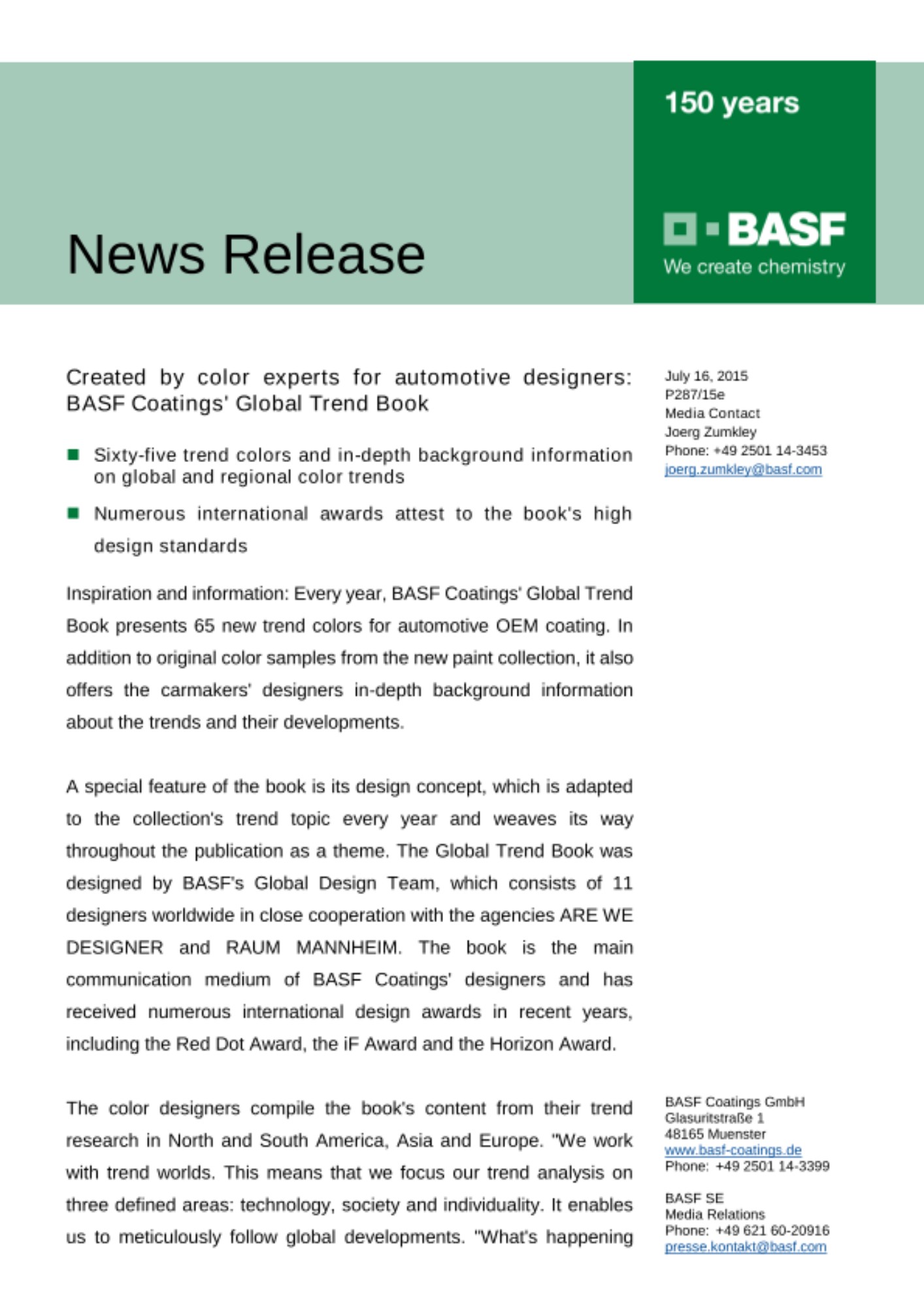 Inspiration and information: Every year, BASF Coatings' Global Trend Book presents 65 new trend colors for automotive OEM coating. In addition to original color samples from the new paint collection, it also offers the carmakers' designers in-depth background information about the trends and their developments.