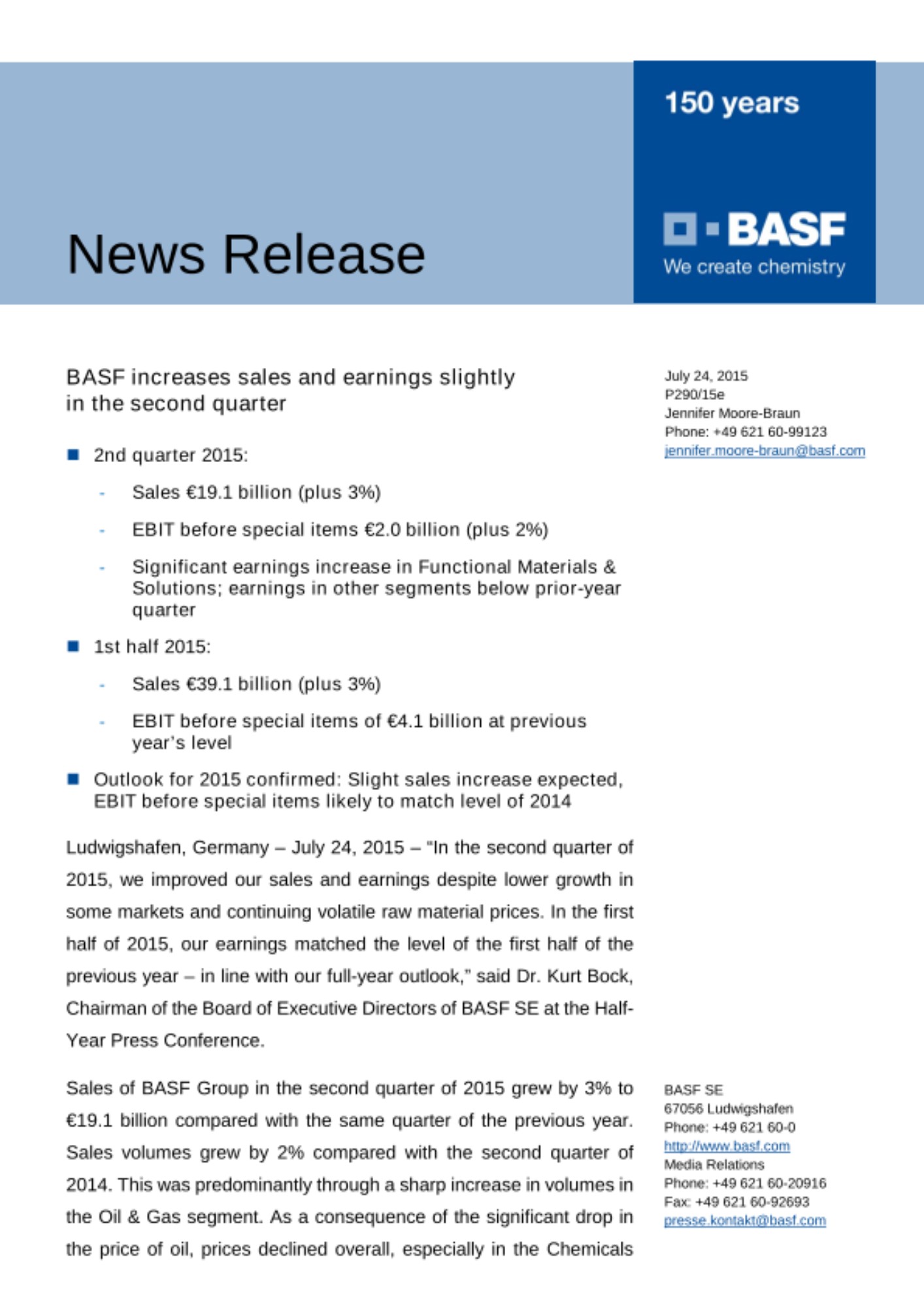 Ludwigshafen, Germany – July 24, 2015 – “In the second quarter of 2015, we improved our sales and earnings despite lower growth in some markets and continuing volatile raw material prices. In the first half of 2015, our earnings matched the level of the first half of the previous year – in line with our full-year outlook,” said Dr. Kurt Bock, Chairman of the Board of Executive Directors of BASF SE at the Half-Year Press Conference.