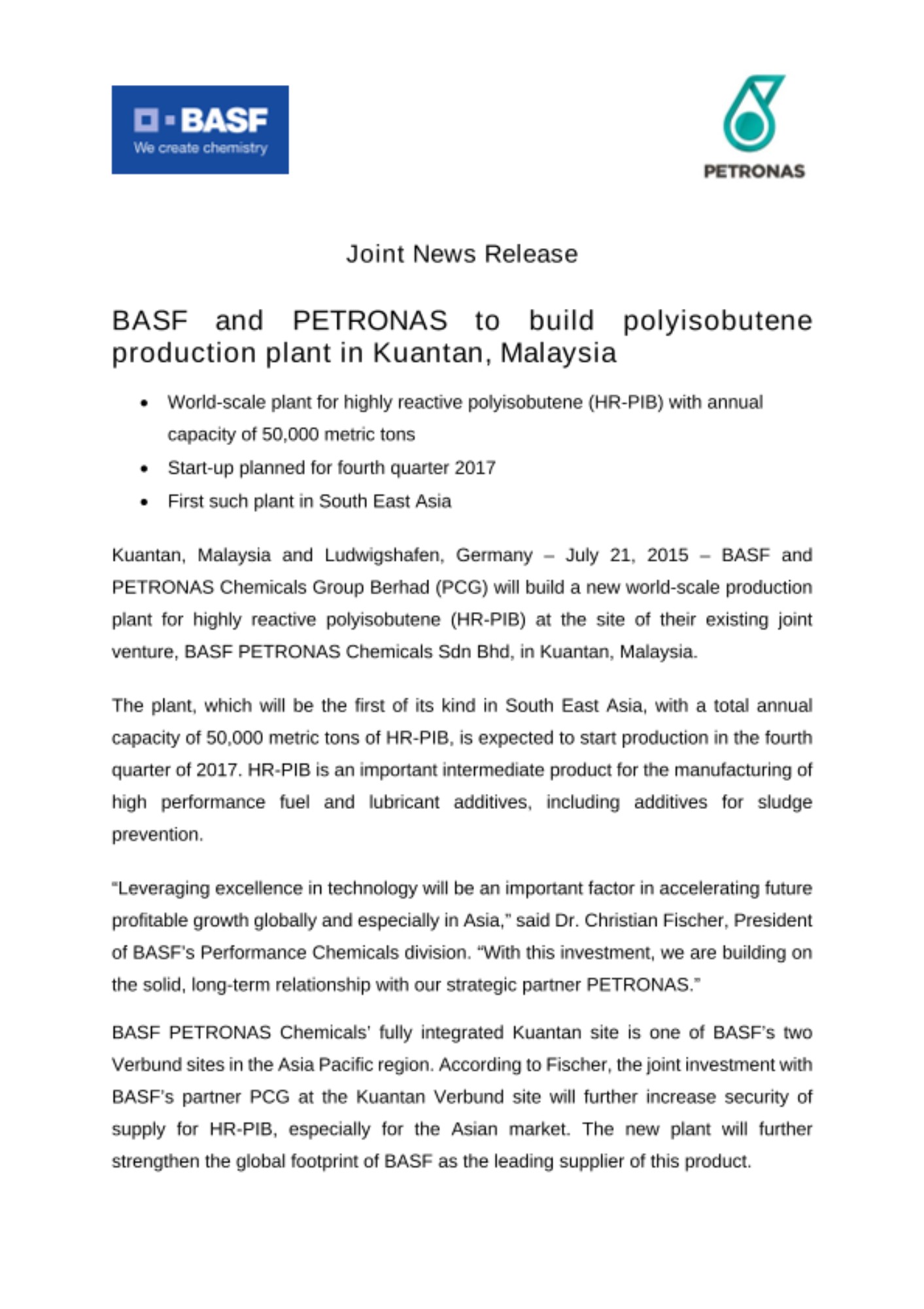 Kuantan, Malaysia and Ludwigshafen, Germany – July 21, 2015 – BASF and PETRONAS Chemicals Group Berhad (PCG) will build a new world-scale production plant for highly reactive polyisobutene (HR-PIB) at the site of their existing joint venture, BASF PETRONAS Chemicals Sdn Bhd, in Kuantan, Malaysia.