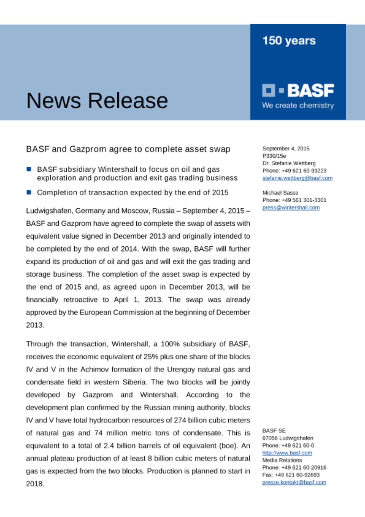 Ludwigshafen, Germany and Moscow, Russia – September 4, 2015 – BASF and Gazprom have agreed to complete the swap of assets with equivalent value signed in December 2013 and originally intended to be completed by the end of 2014. With the swap, BASF will further expand its production of oil and gas and will exit the gas trading and storage business. The completion of the asset swap is expected by the end of 2015 and, as agreed upon in December 2013, will be financially retroactive to April 1, 2013. The swap was already approved by the European Commission at the beginning of December 2013.