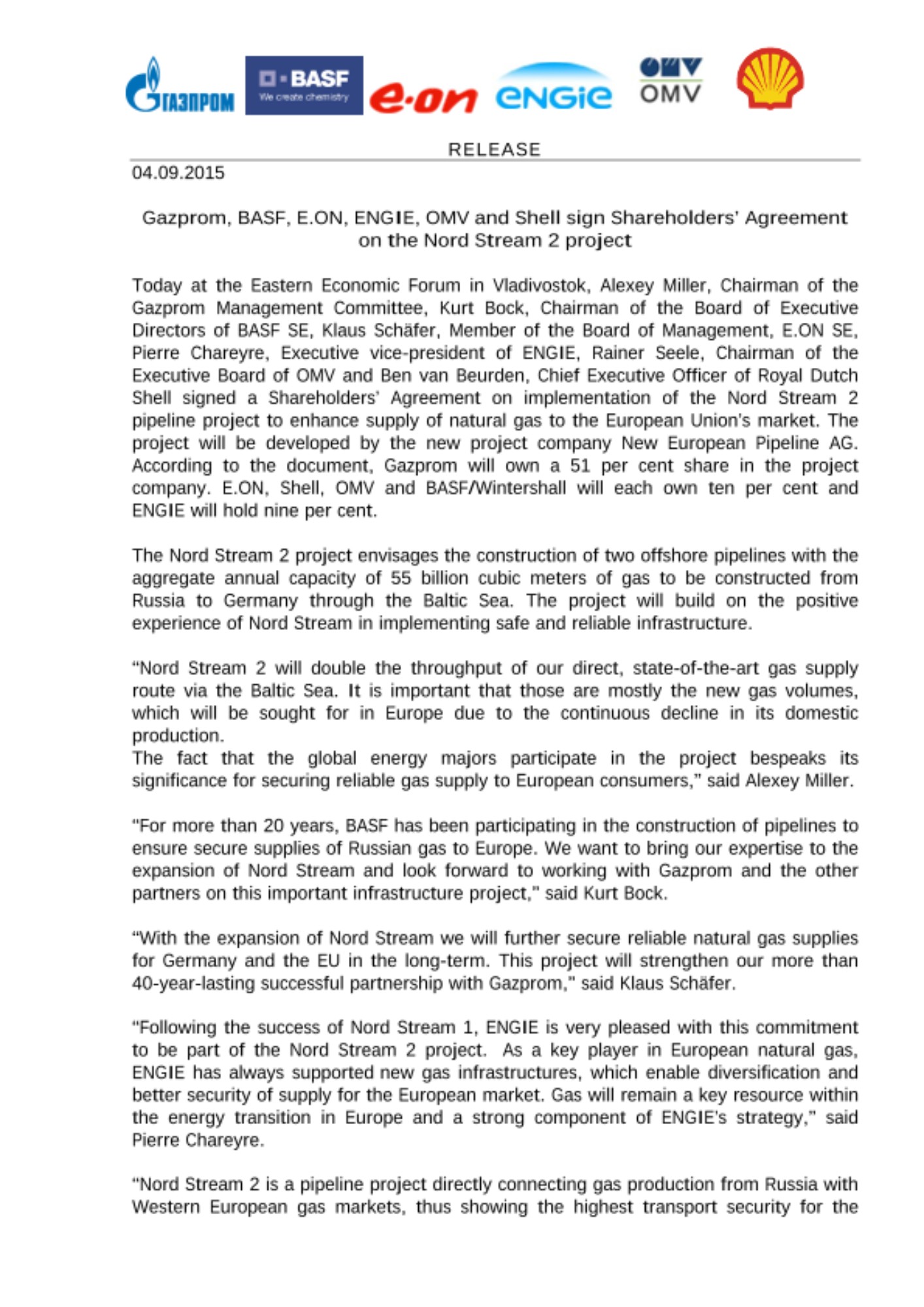 Gazprom, BASF, E.ON, ENGIE, OMV and Shell sign Shareholders’ Agreement on the Nord Stream 2 project