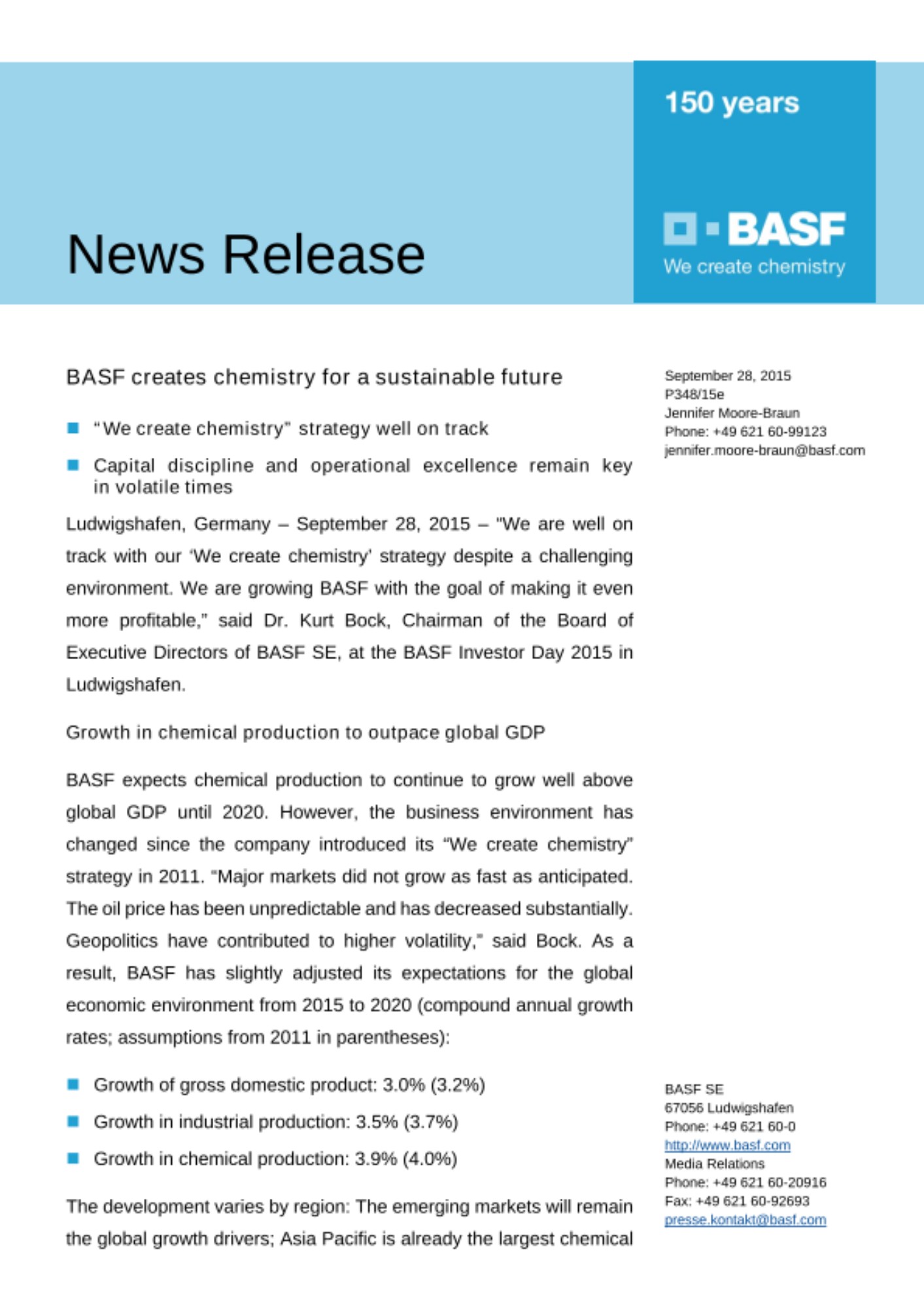 Ludwigshafen, Germany – September 28, 2015 – “We are well on track with our ‘We create chemistry’ strategy despite a challenging environment. We are growing BASF with the goal of making it even more profitable,” said Dr. Kurt Bock, Chairman of the Board of Executive Directors of BASF SE, at the BASF Investor Day 2015 in Ludwigshafen.