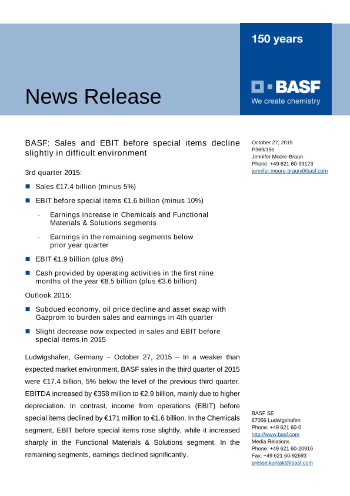 Ludwigshafen, Germany – October 27, 2015 – In a weaker than expected market environment, BASF sales in the third quarter of 2015 were €17.4 billion, 5% below the level of the previous third quarter. EBITDA increased by €358 million to €2.9 billion, mainly due to higher depreciation. In contrast, income from operations (EBIT) before special items declined by €171 million to €1.6 billion. In the Chemicals segment, EBIT before special items rose slightly, while it increased sharply in the Functional Materials & Solutions segment. In the remaining segments, earnings declined significantly.
