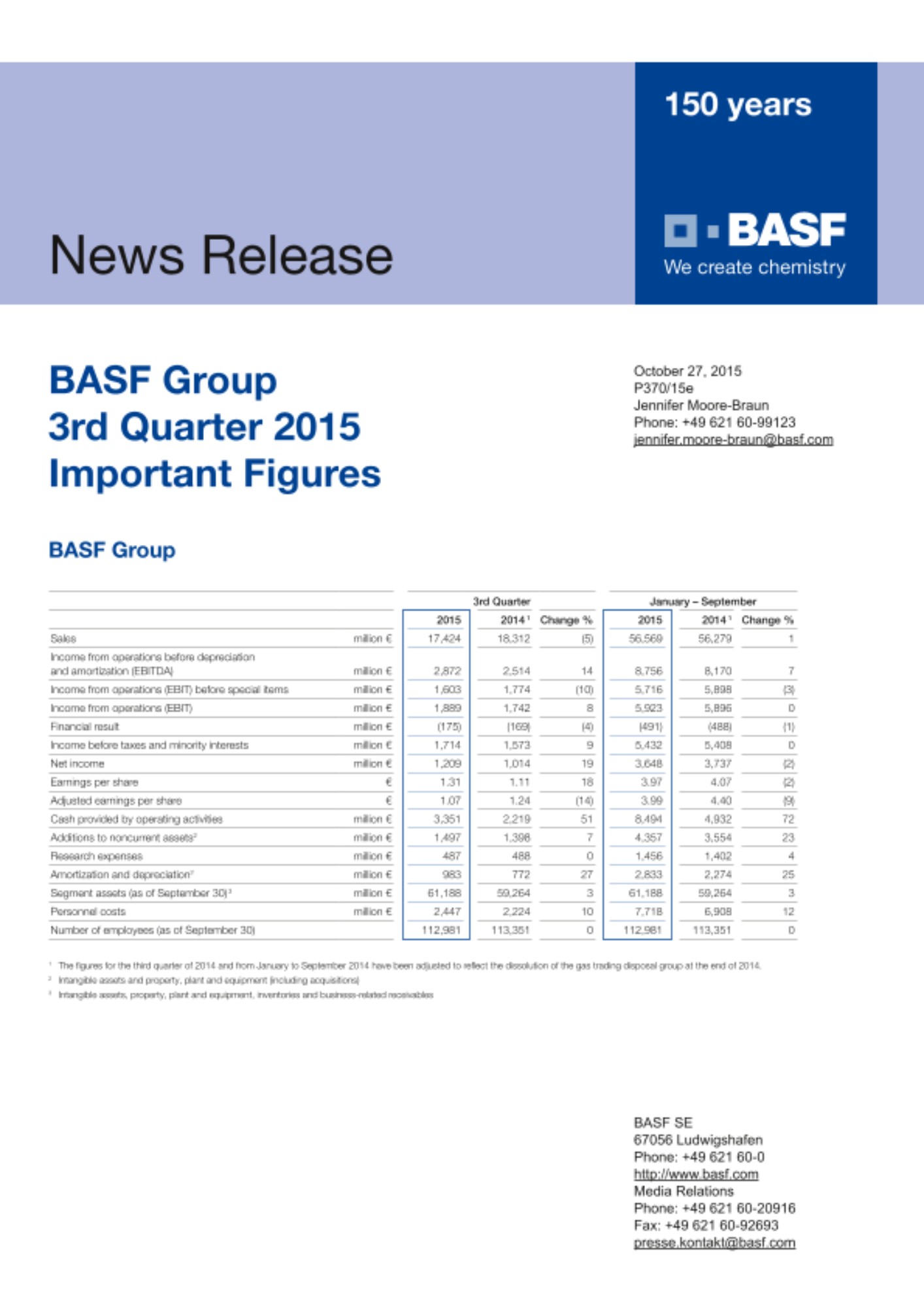 In the first nine months of 2015, sales of BASF Group were around €56.6 billion, 1% higher than in the same period of the previous year. EBIT before special items declined by €182 million to €5.7 billion. At €5.9 billion, EBIT in the first nine months of 2015 reached the same level as in the same period of the previous year.