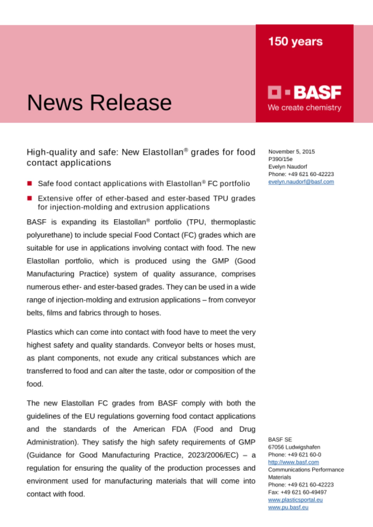 More information can be found on the internet at: www.performance-materials.basf.com and www.elastollan.de
