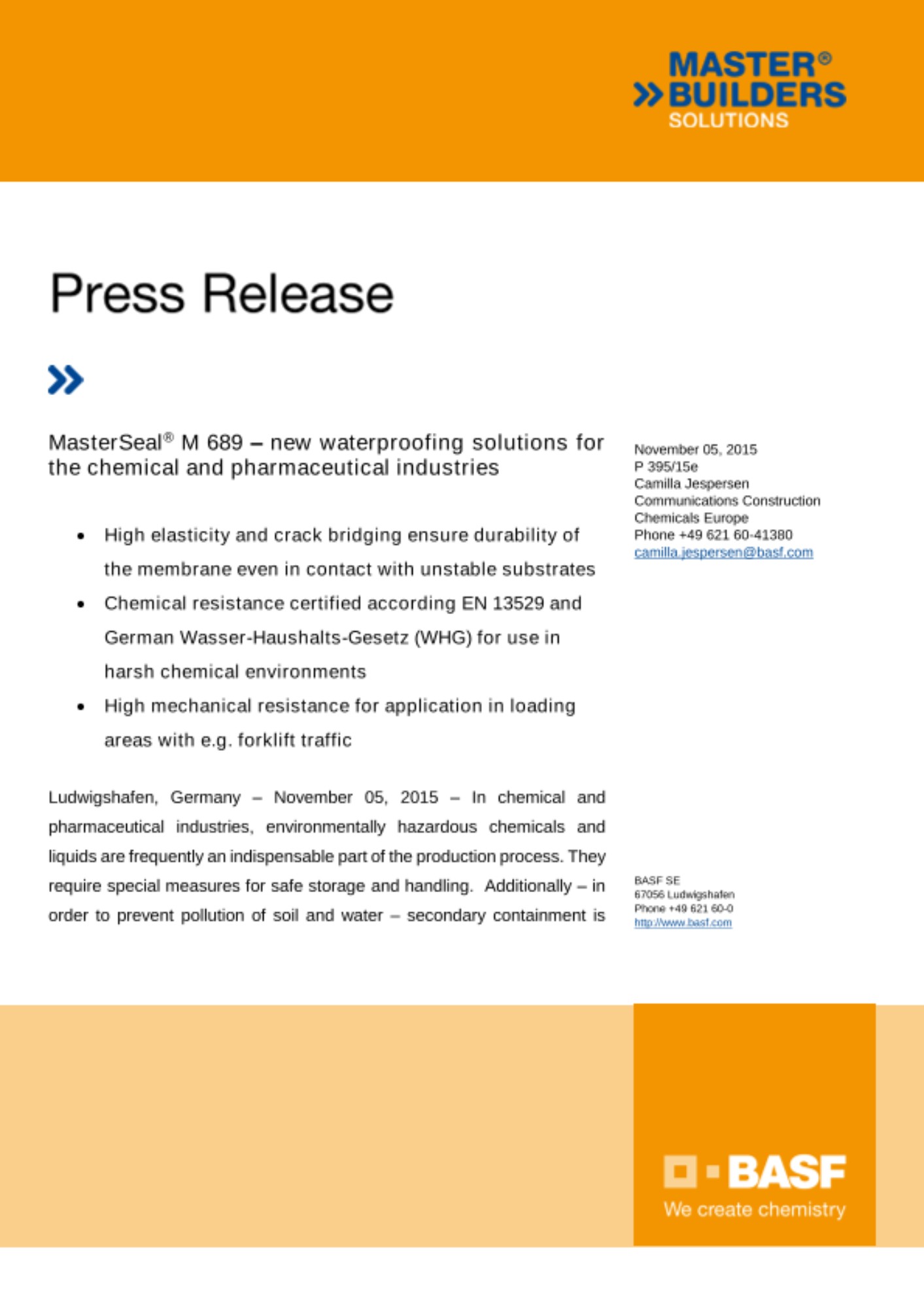 Ludwigshafen, Germany – November 05, 2015 – In chemical and pharmaceutical industries, environmentally hazardous chemicals and liquids are frequently an indispensable part of the production process. They require special measures for safe storage and handling. Additionally – in order to prevent pollution of soil and water – secondary containment is required by national laws to control eventual liquid spillages to protect the environment. Especially for this purpose Master Builders Solutions by BASF offers waterproofing solutions also for complex industrial structures.