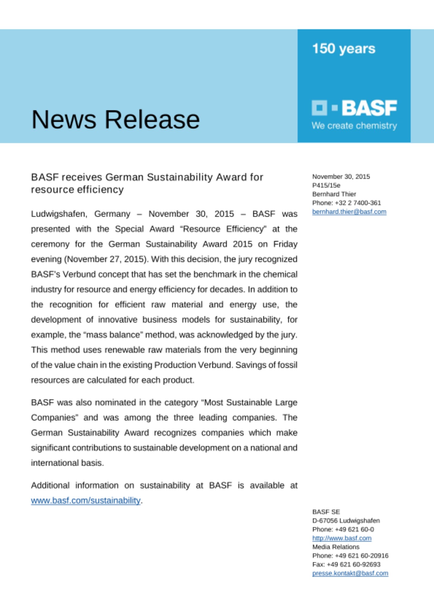 Ludwigshafen, Germany – November 30, 2015 – BASF was presented with the Special Award “Resource Efficiency” at the ceremony for the German Sustainability Award 2015 on Friday evening (November 27, 2015). With this decision, the jury recognized BASF’s Verbund concept that has set the benchmark in the chemical industry for resource and energy efficiency for decades. In addition to the recognition for efficient raw material and energy use, the development of innovative business models for sustainability, for example, the “mass balance” method, was acknowledged by the jury. This method uses renewable raw materials from the very beginning of the value chain in the existing Production Verbund. Savings of fossil resources are calculated for each product.