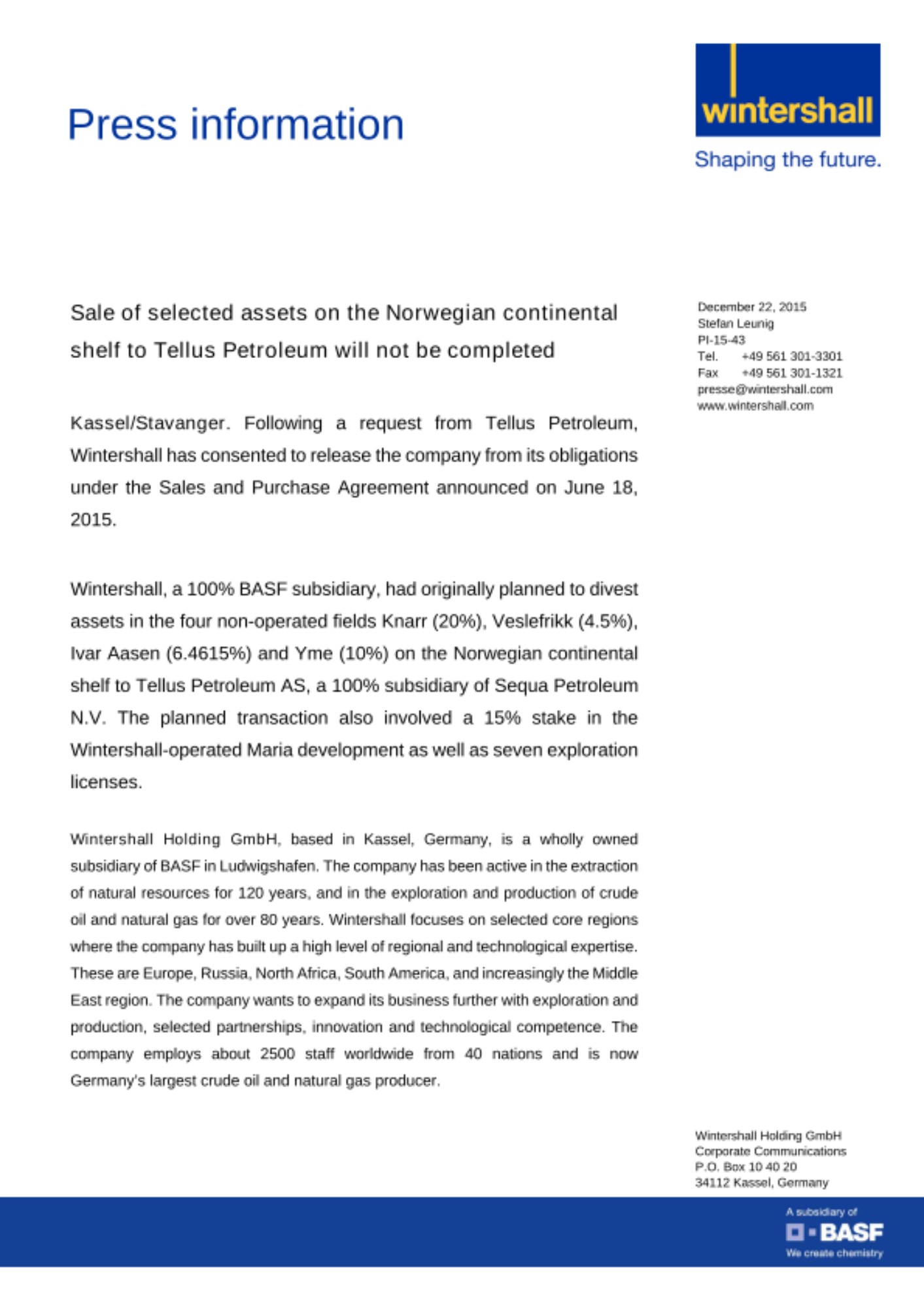 Kassel/Stavanger. Following a request from Tellus Petroleum, Wintershall has consented to release the company from its obligations under the Sales and Purchase Agreement announced on June 18, 2015.