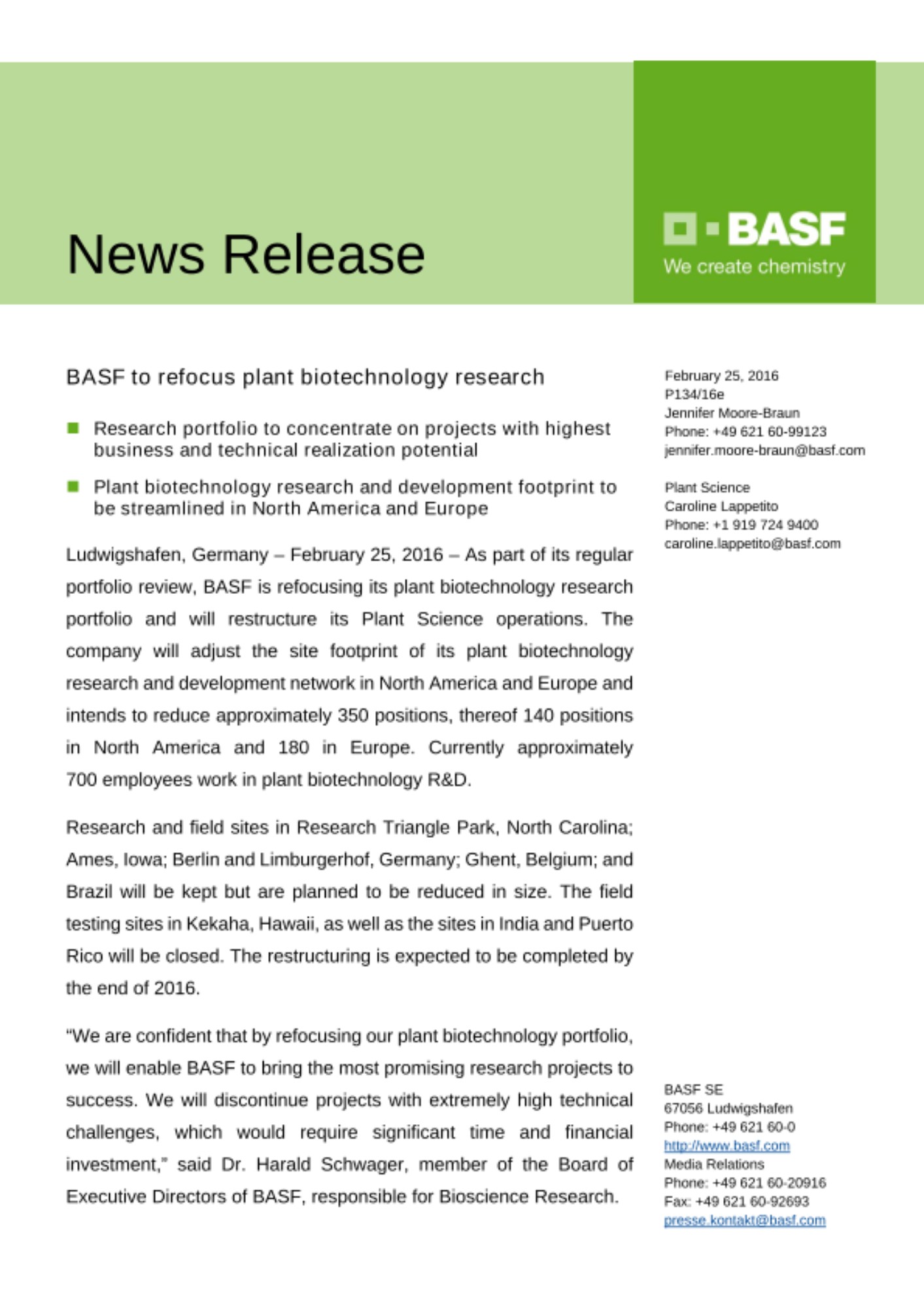 Ludwigshafen, Germany – February 25, 2016 – As part of its regular portfolio review, BASF is refocusing its plant biotechnology research portfolio and will restructure its Plant Science operations. The company will adjust the site footprint of its plant biotechnology research and development network in North America and Europe and intends to reduce approximately 350 positions, thereof 140 positions in North America and 180 in Europe. Currently approximately 700 employees work in plant biotechnology R&D.