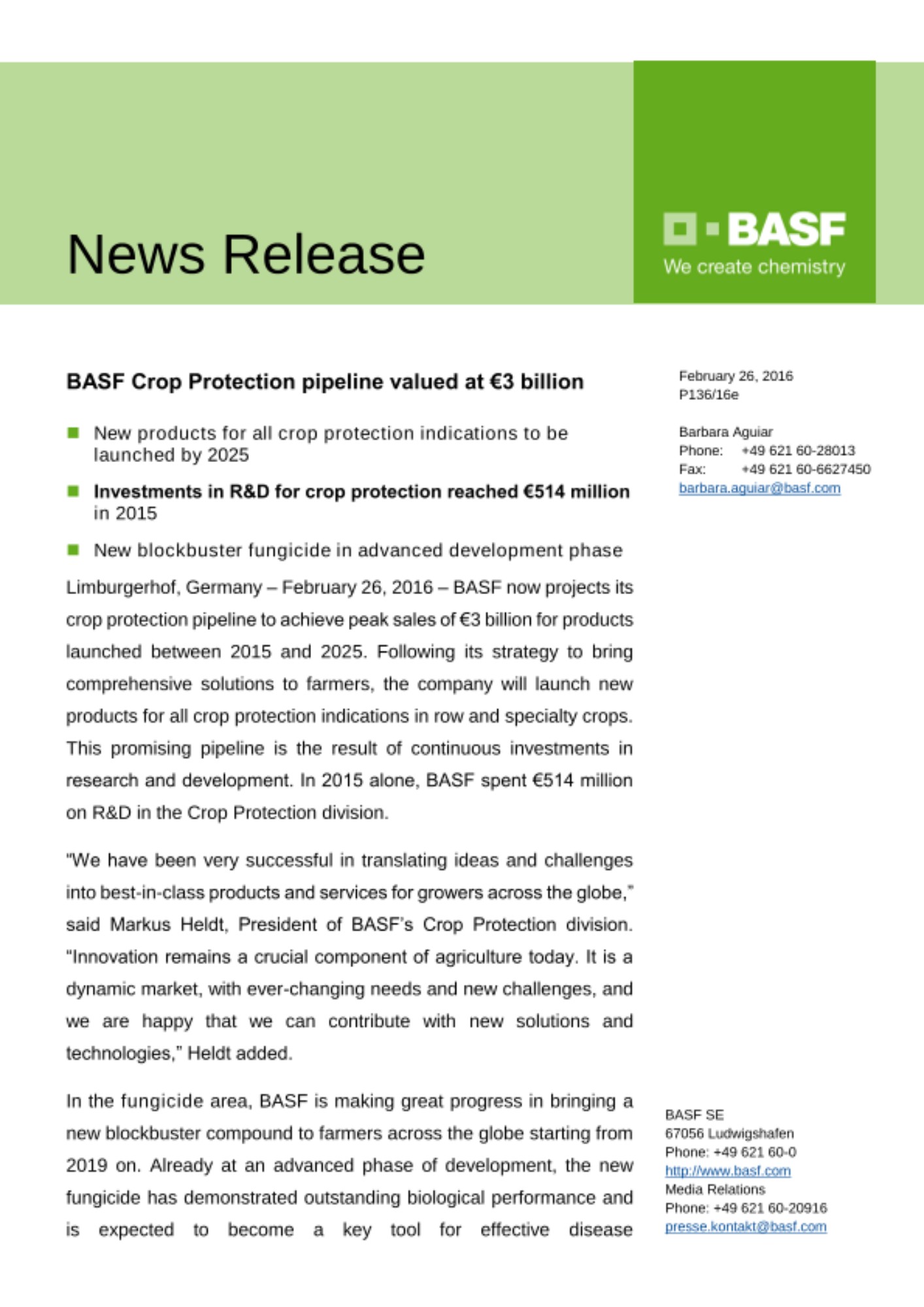 Limburgerhof, Germany – February 26, 2016 – BASF now projects its crop protection pipeline to achieve peak sales of €3 billion for products launched between 2015 and 2025. Following its strategy to bring comprehensive solutions to farmers, the company will launch new products for all crop protection indications in row and specialty crops. This promising pipeline is the result of continuous investments in research and development. In 2015 alone, BASF spent €514 million on R&D in the Crop Protection division.