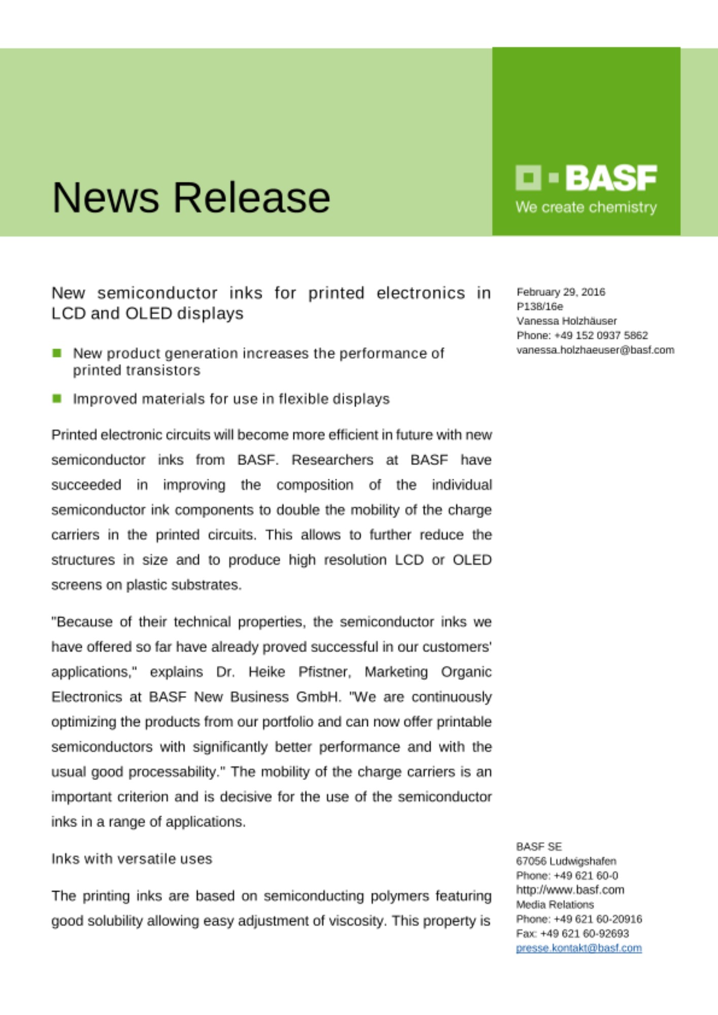 "Because of their technical properties, the semiconductor inks we have offered so far have already proved successful in our customers' applications," explains Dr. Heike Pfistner, Marketing Organic Electronics at BASF New Business GmbH. "We are continuously optimizing the products from our portfolio and can now offer printable semiconductors with significantly better performance and with the usual good processability." The mobility of the charge carriers is an important criterion and is decisive for the use of the semiconductor inks in a range of applications.