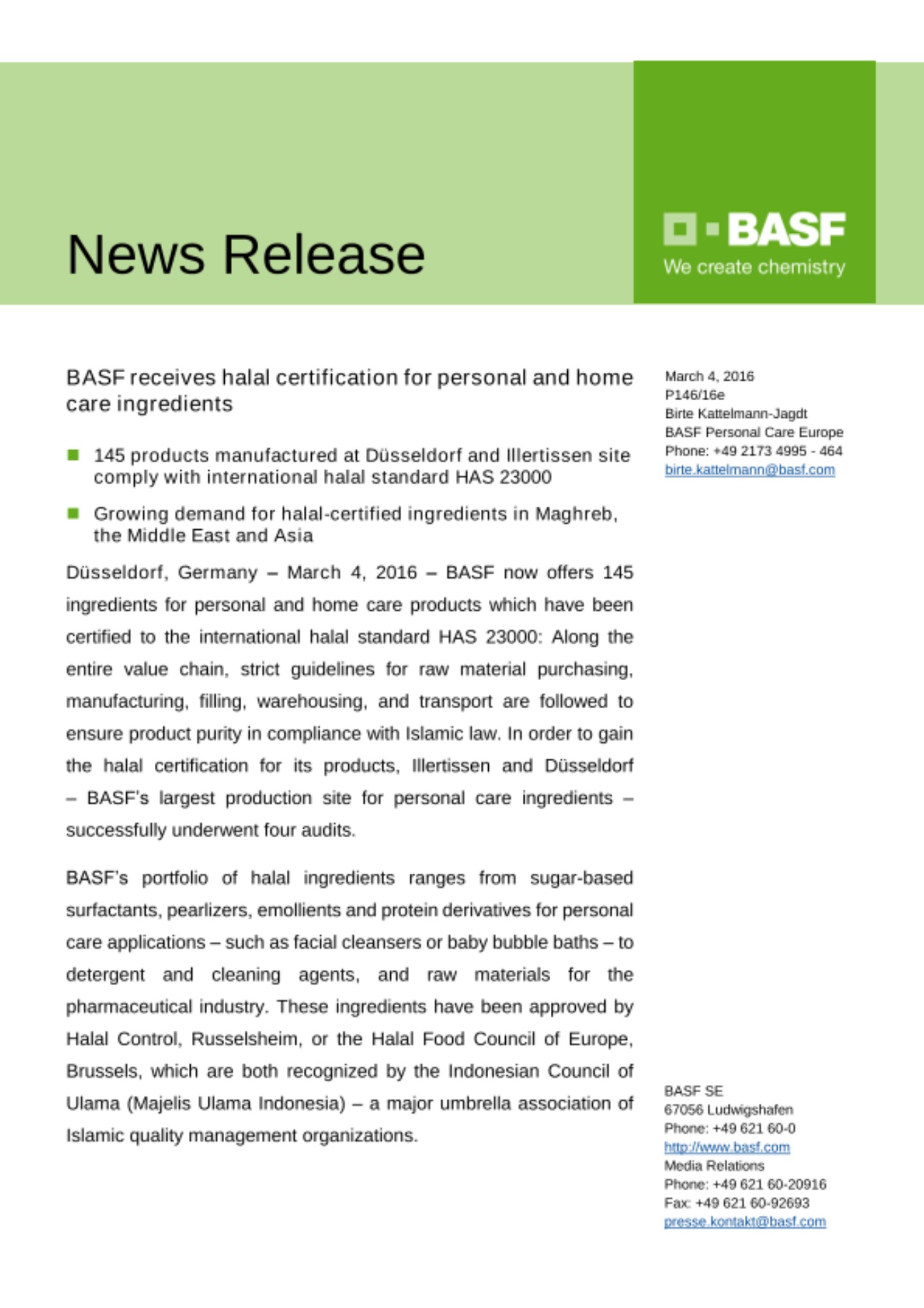 Düsseldorf, Germany – March 4, 2016 – BASF now offers 145 ingredients for personal and home care products which have been certified to the international halal standard HAS 23000: Along the entire value chain, strict guidelines for raw material purchasing, manufacturing, filling, warehousing, and transport are followed to ensure product purity in compliance with Islamic law. In order to gain the halal certification for its products, Illertissen and Düsseldorf
